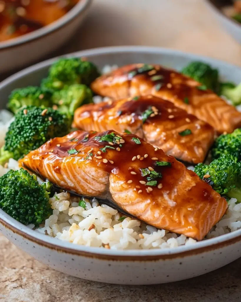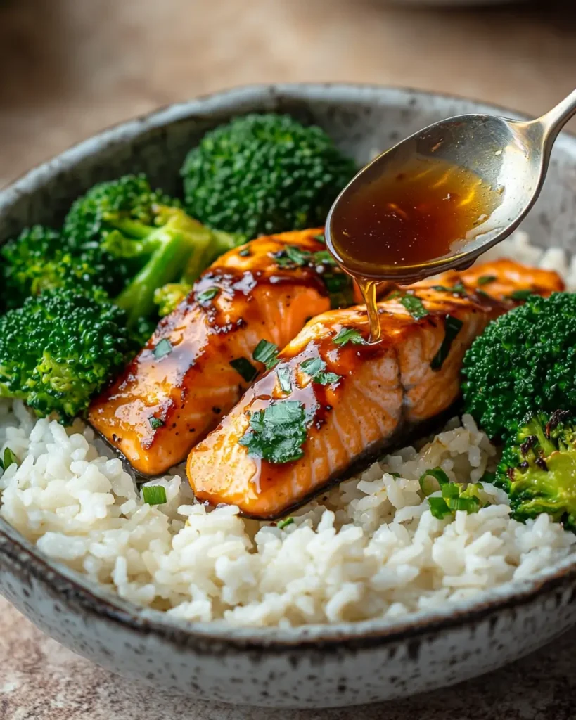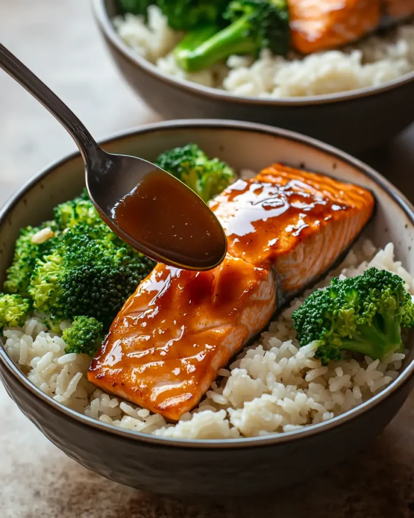 - To build your bowls, spoon rice into each bowl, top with salmon, and add broccoli on the side. Drizzle extra teriyaki sauce over everything.