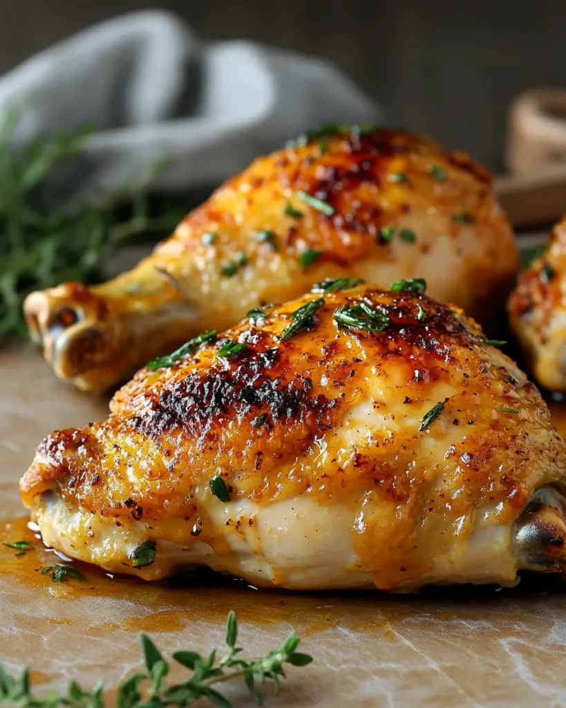 7. Bake for 1 hour and 15 to 1 hour and 30 minutes, or until the internal temperature reaches 165 degrees in the thickest part of the thigh.