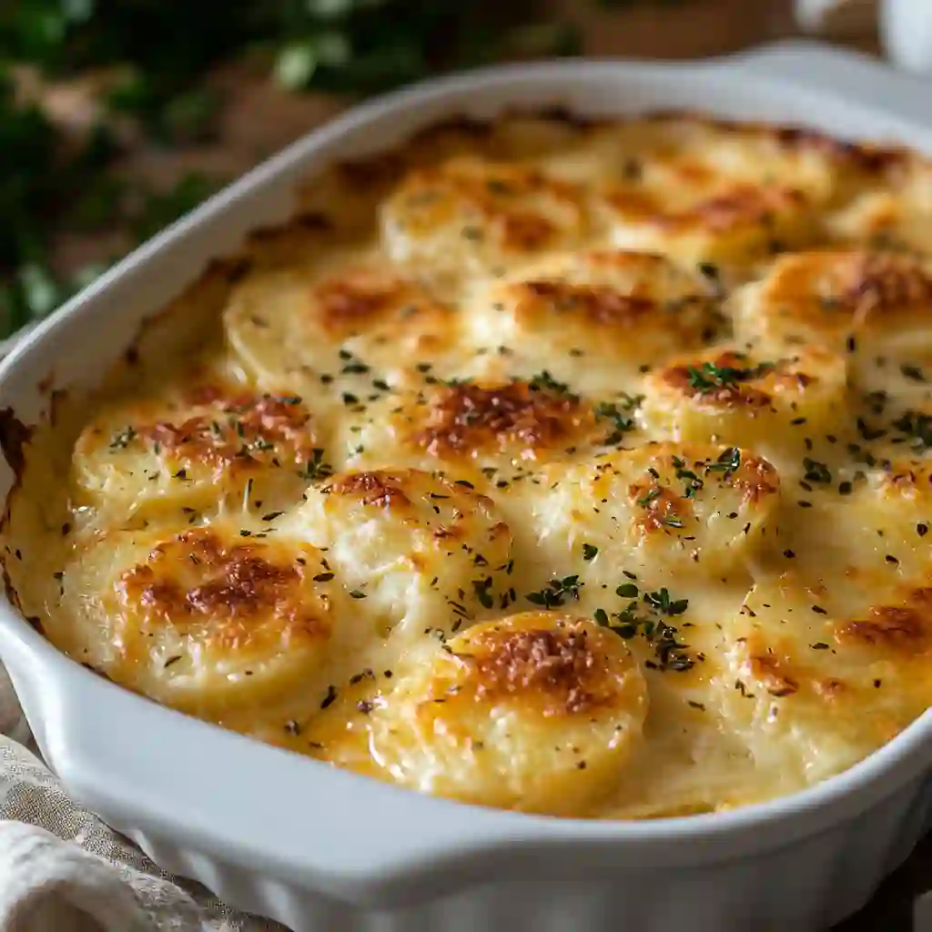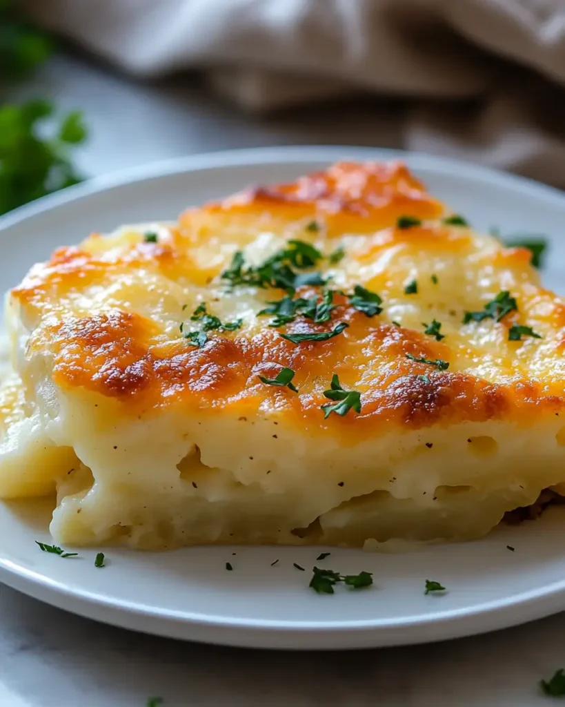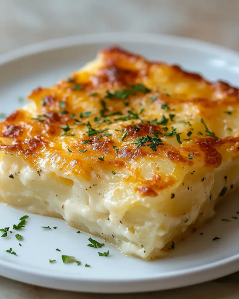 Cheesey Scalloped Potato Recipe served on a simple white plate with golden cheesy top and fresh parsley sprinkle, creamy texture and crispy edges, Ama’s cozy coastal kitchen style, very light brown marble background, soft morning lighting, DSLR, 85mm lens, tight close-up –ar 4:5 –stylize 250 –style raw
