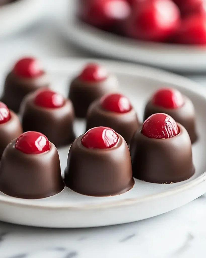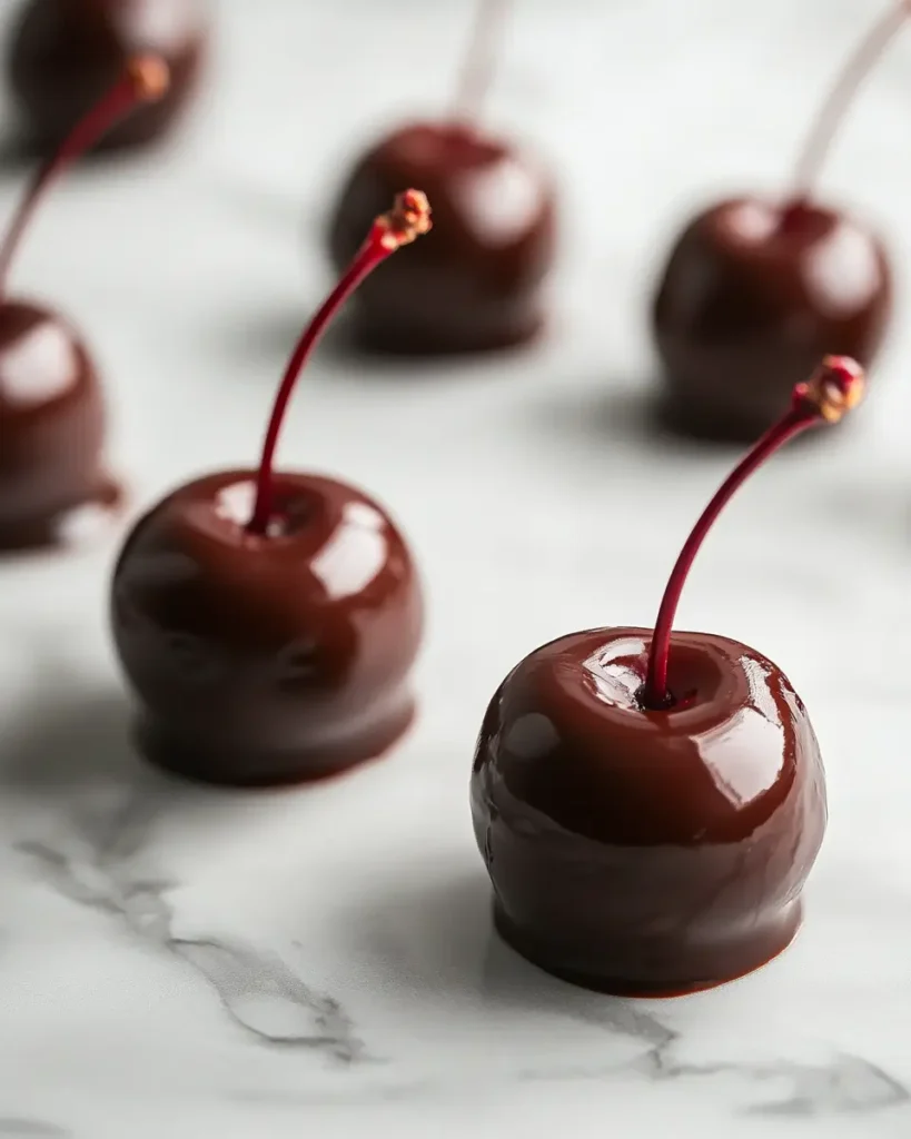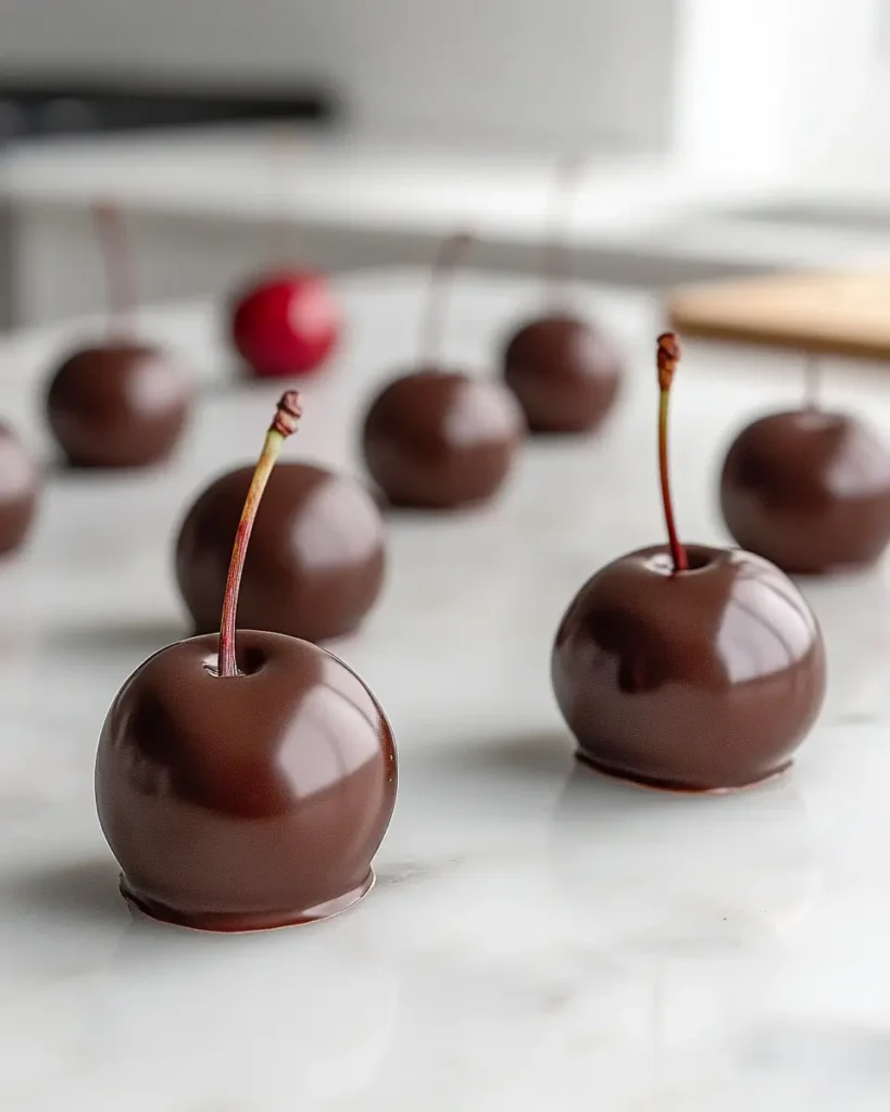 The cherries shown here were made using a chocolate mold for a smooth, uniform finish. If you prefer this style, spoon melted chocolate into a mold, press in a fresh cherry, and chill before releasing.