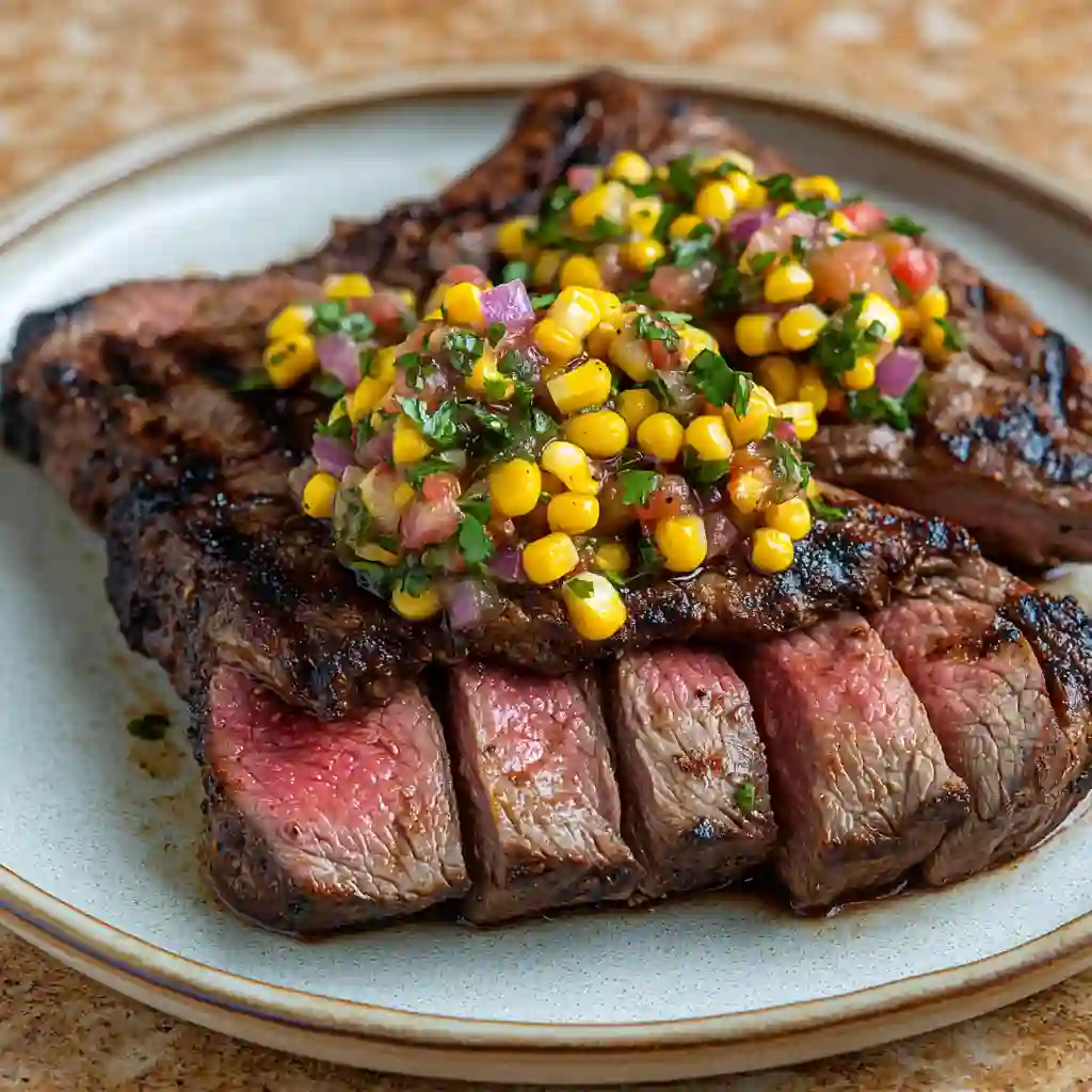 - Slice the rested steaks across the grain. Serve them on a plate and spoon the fresh corn salsa on top.