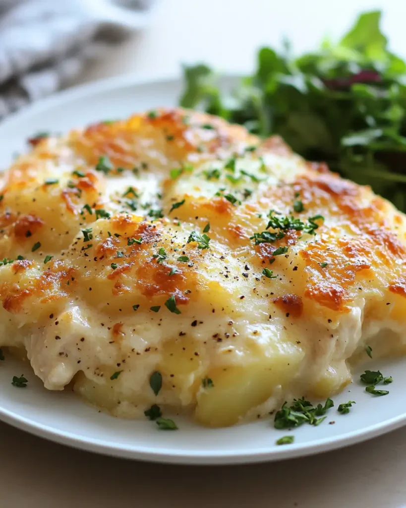 This Creamy Chicken Scalloped Potatoes dish is filling on its own, but you can add a fresh green salad or steamed broccoli on the side. The creamy texture pairs well with crisp vegetables. It also fits perfectly into your list of Healthy Dinner Recipes when served with simple greens.
