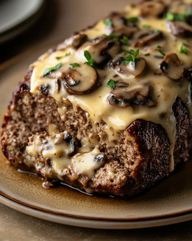 This creamy meatloaf is wonderful served with mashed potatoes, roasted carrots, or a simple green salad. The creamy mushroom and Swiss flavors pair nicely with warm vegetables and soft dinner rolls.