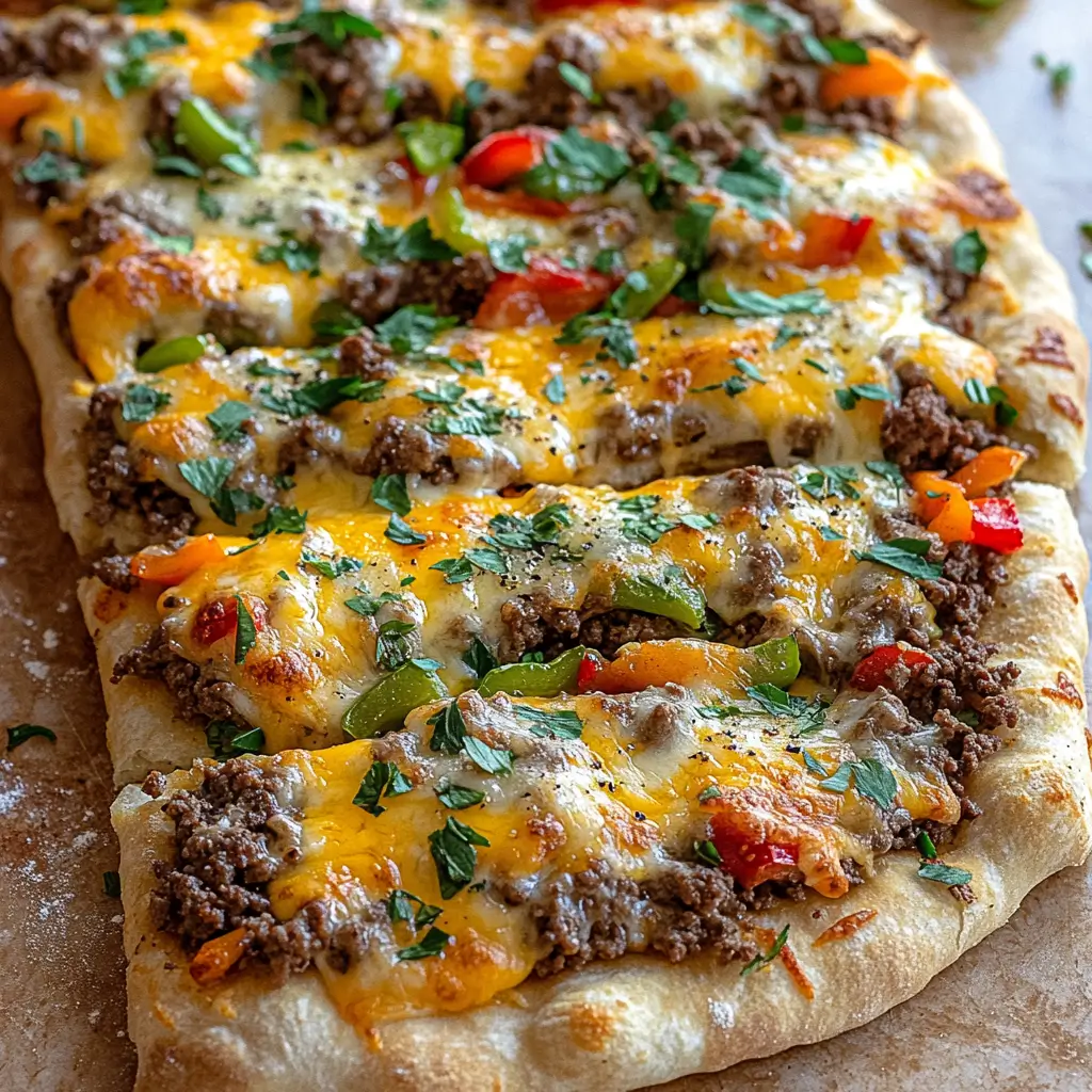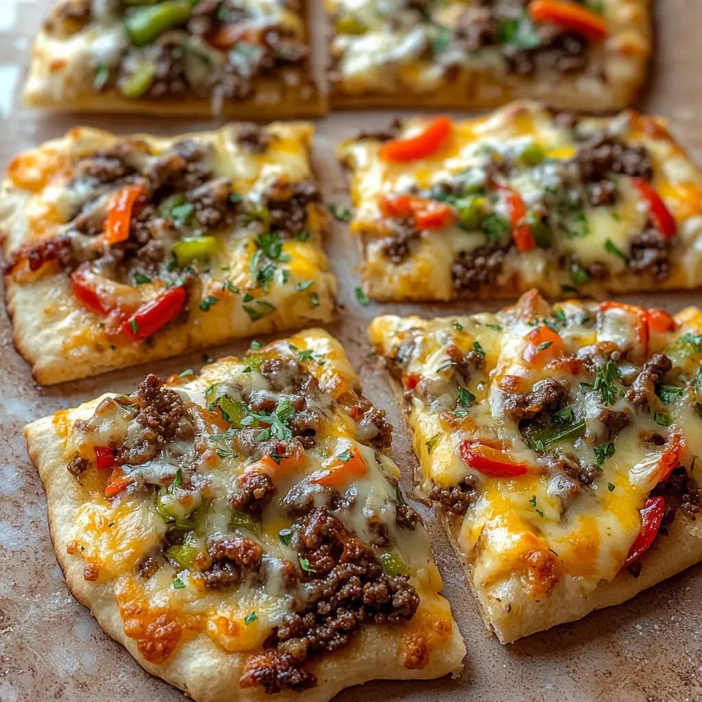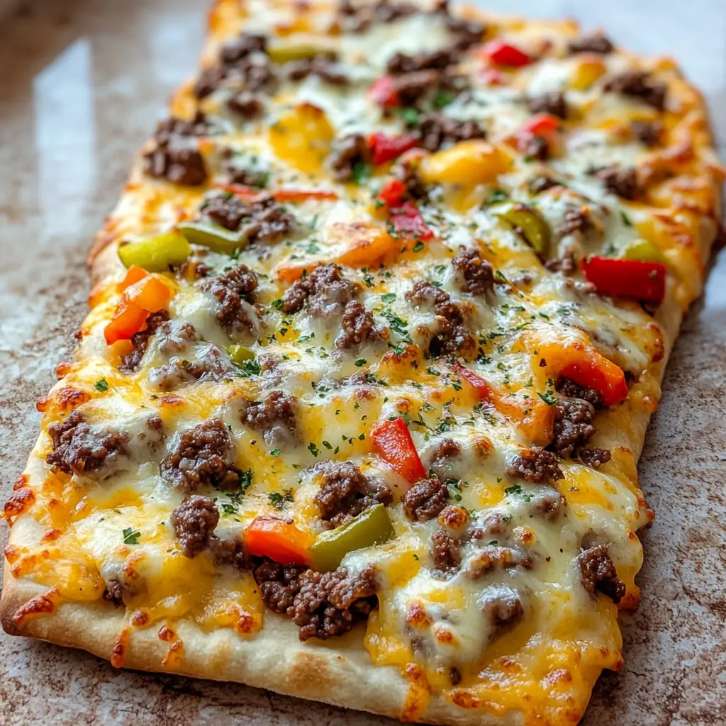 Crispy flatbread topped with juicy seasoned beef, sautéed peppers, and melted cheese creates a rich, satisfying bite. This quick and easy recipe delivers bold cheesesteak flavor with a golden crust, perfect for busy weeknight dinners.