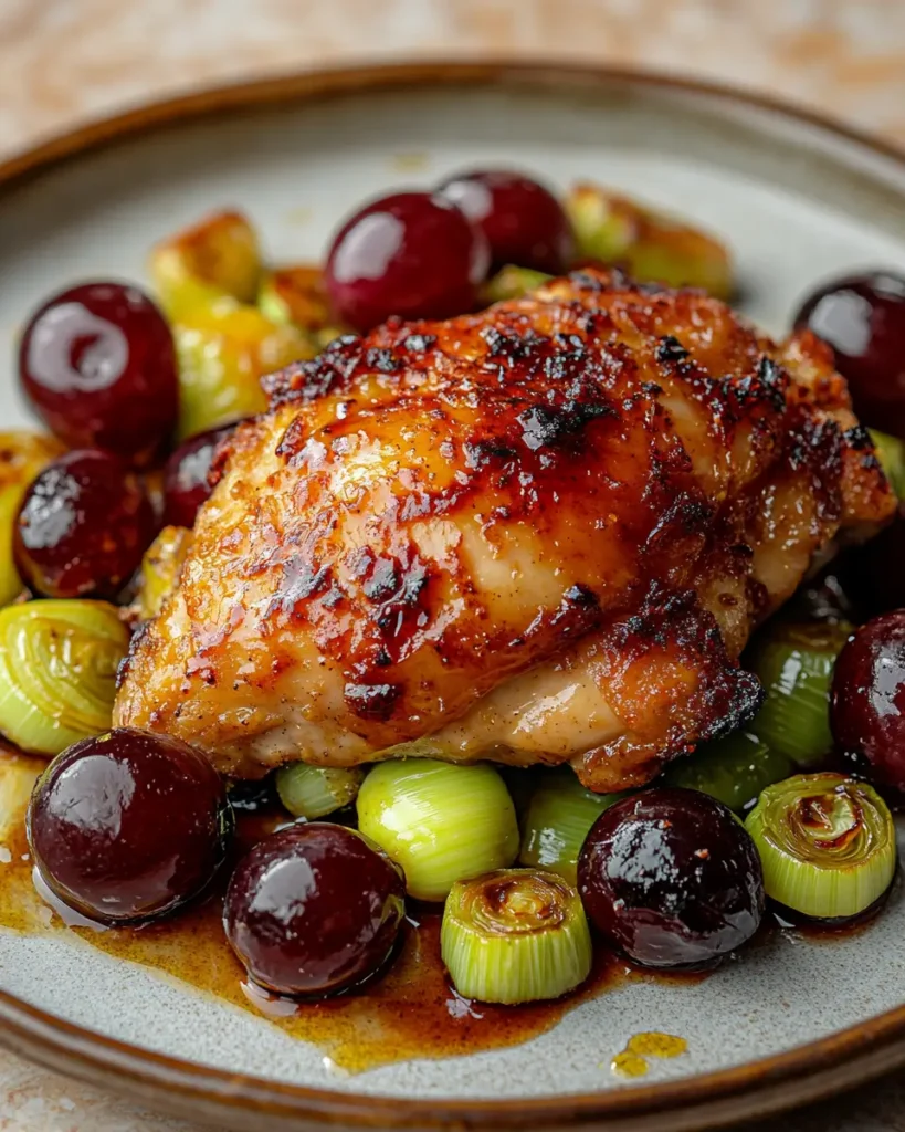 Both red and black seedless grapes work beautifully in this recipe. They roast well and become soft and slightly caramelized in the oven. Green grapes can also be used if that is what you have. The key is to choose grapes that are firm and sweet. As they cook, they release juices that mix with the chicken and leeks to create a light and flavorful sauce.