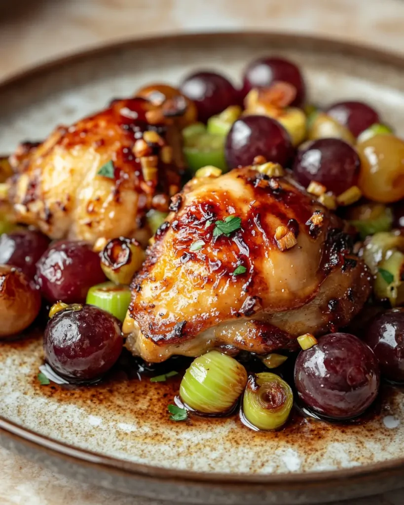 Yes, chicken breasts work well if that is what you have in the refrigerator. Many easy chicken breast recipes use a similar method. The key is to avoid overcooking them so they stay juicy. If the breasts are thick, slice them in half lengthwise before cooking. This helps them cook evenly in the skillet. You can still roast the grapes and leeks the same way. The flavor combination will stay sweet, savory, and comforting.