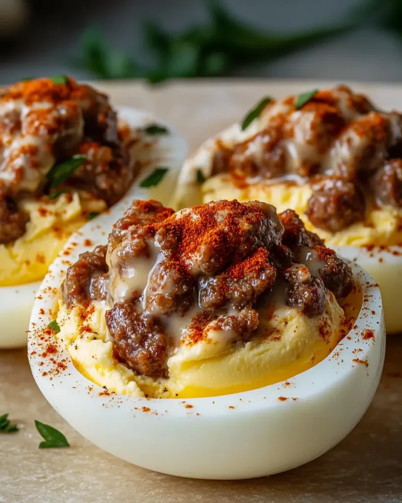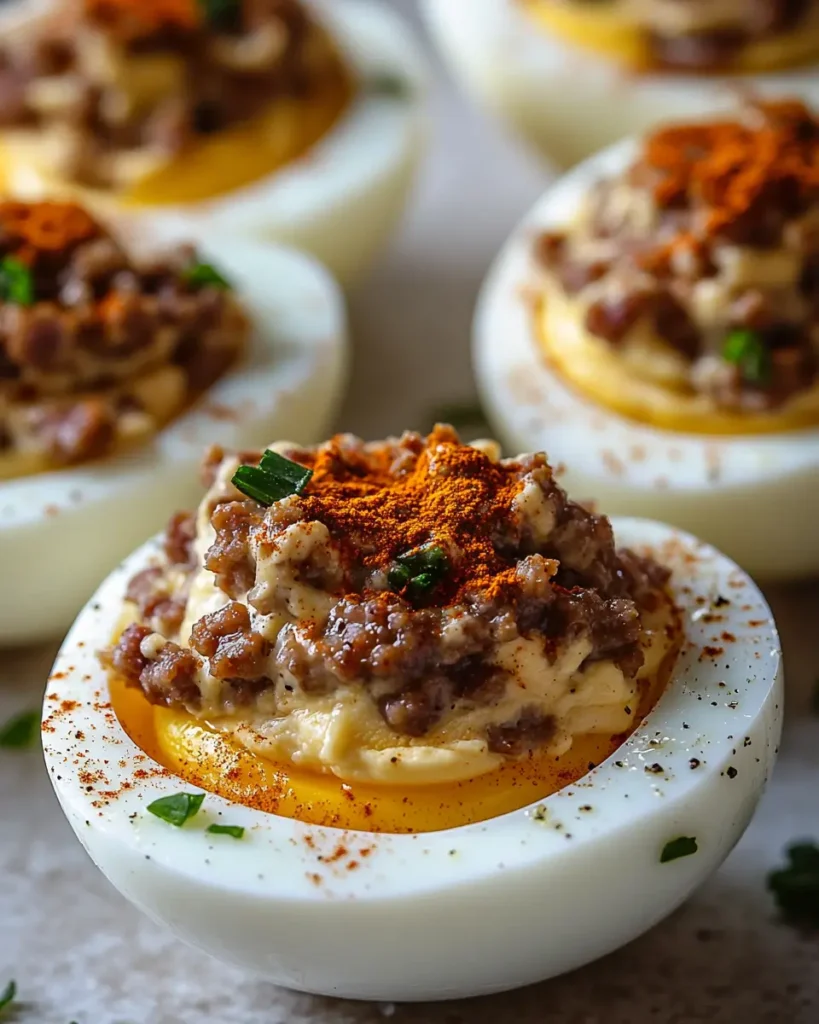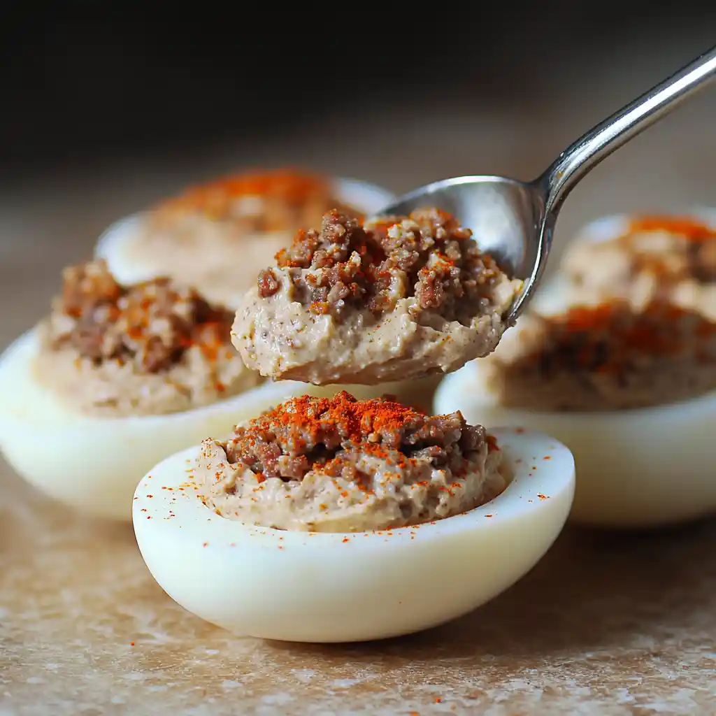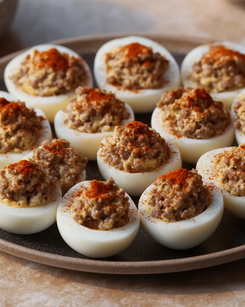 Creamy devilled eggs filled with a savory mixture of mashed yolks, mayonnaise, mustard, and browned sausage. This quick and flavorful appetizer is perfect for parties, snacks, or gatherings and comes together in about 20 minutes.