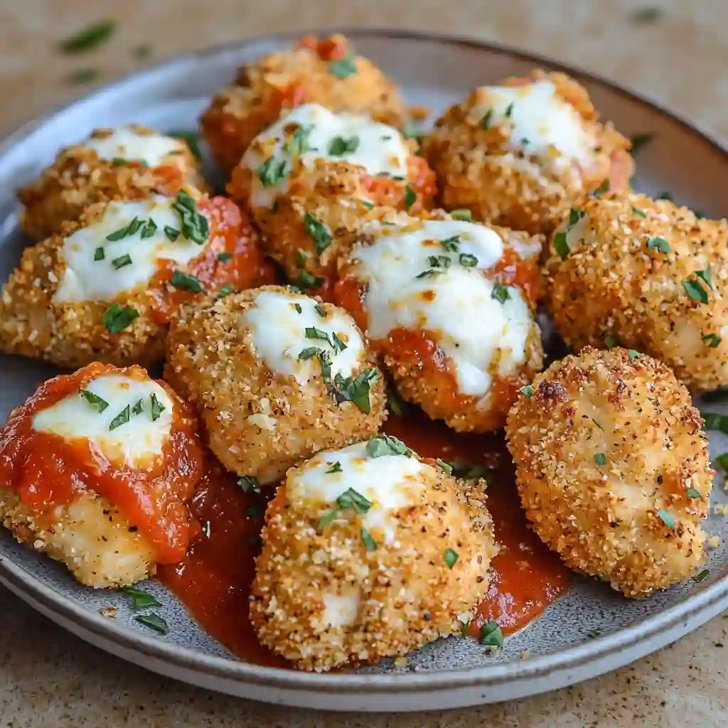 Crispy air fryer chicken parmesan bites are quick, cheesy, and full of flavor. Tender chicken pieces are coated in seasoned breadcrumbs, air fried until golden, then topped with marinara and melted mozzarella for a simple and satisfying dinner.