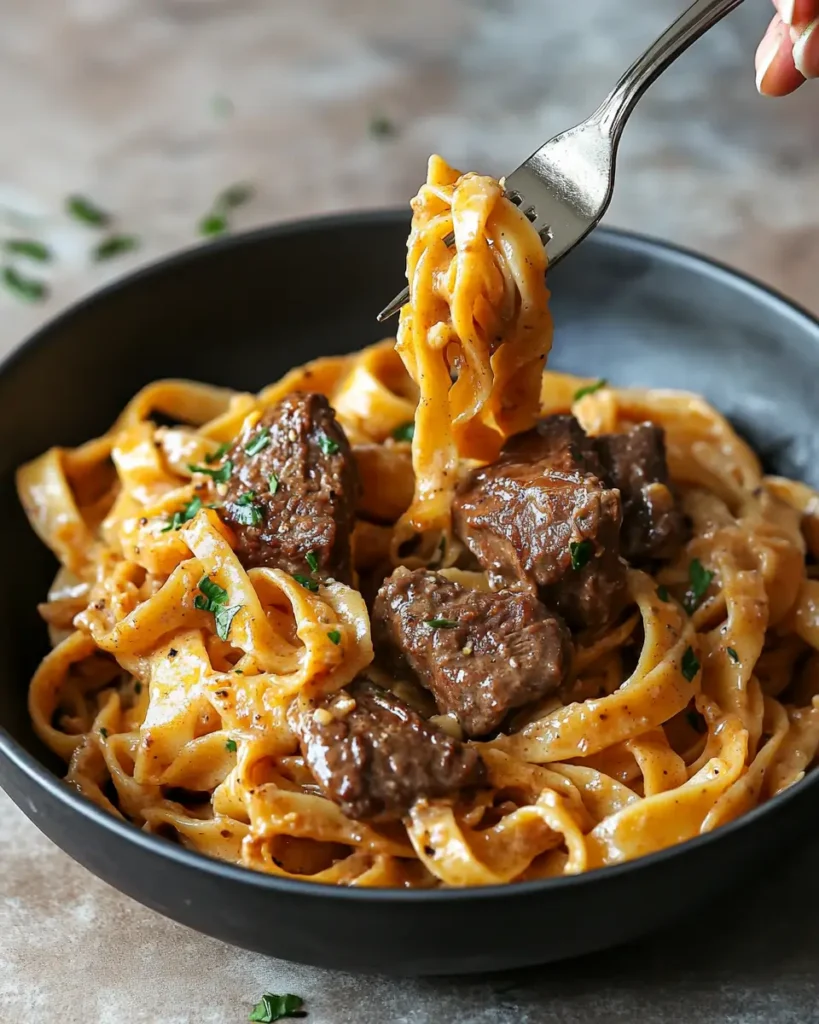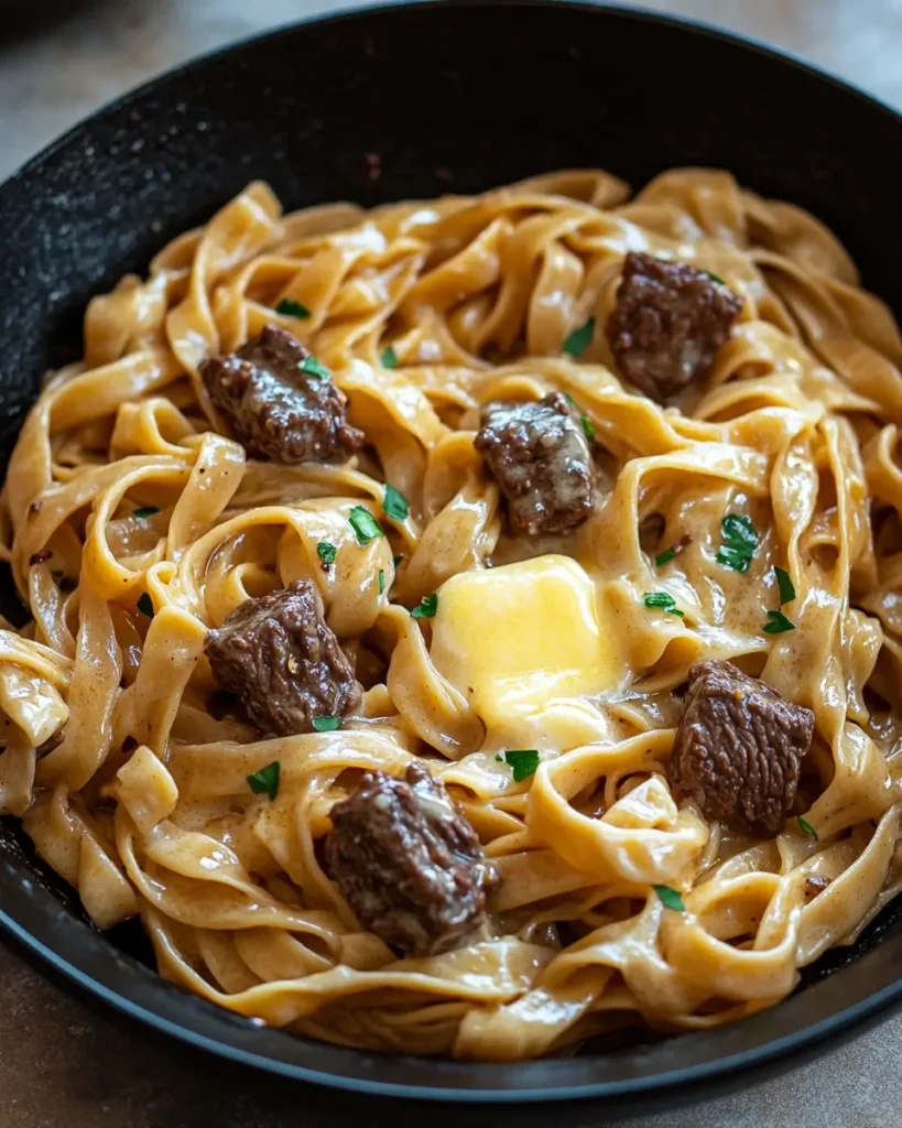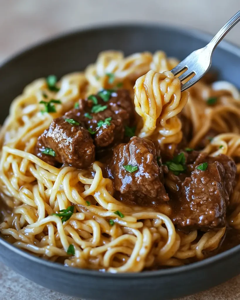 While this dish is best made quickly on the stove, you can adapt parts of it. Cook the beef and broth in the slow cooker, then stir in cooked noodles and butter at the end. It is not a traditional slow cooker recipe, but it can work if you need a hands off option. Just keep an eye on the texture so the noodles stay soft, not mushy.