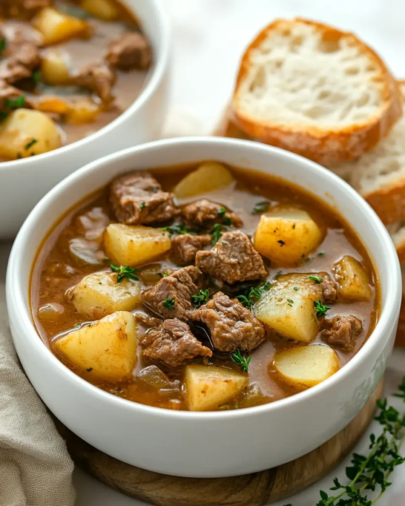 Do not cut the potatoes too small, or they may turn mushy. Keep them in even chunks so they cook evenly. Avoid high heat once the soup starts boiling. Gentle simmering keeps the beef tender and the broth clear. If adding cheese, do it at the end so it melts smoothly and does not clump.