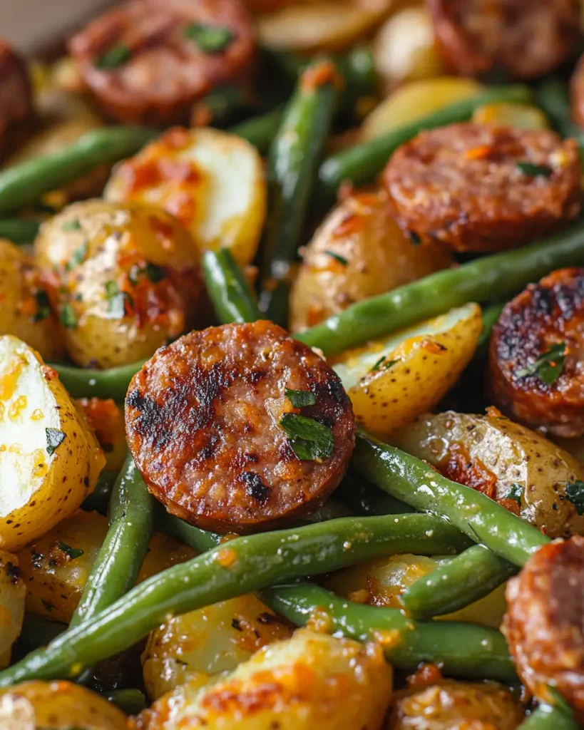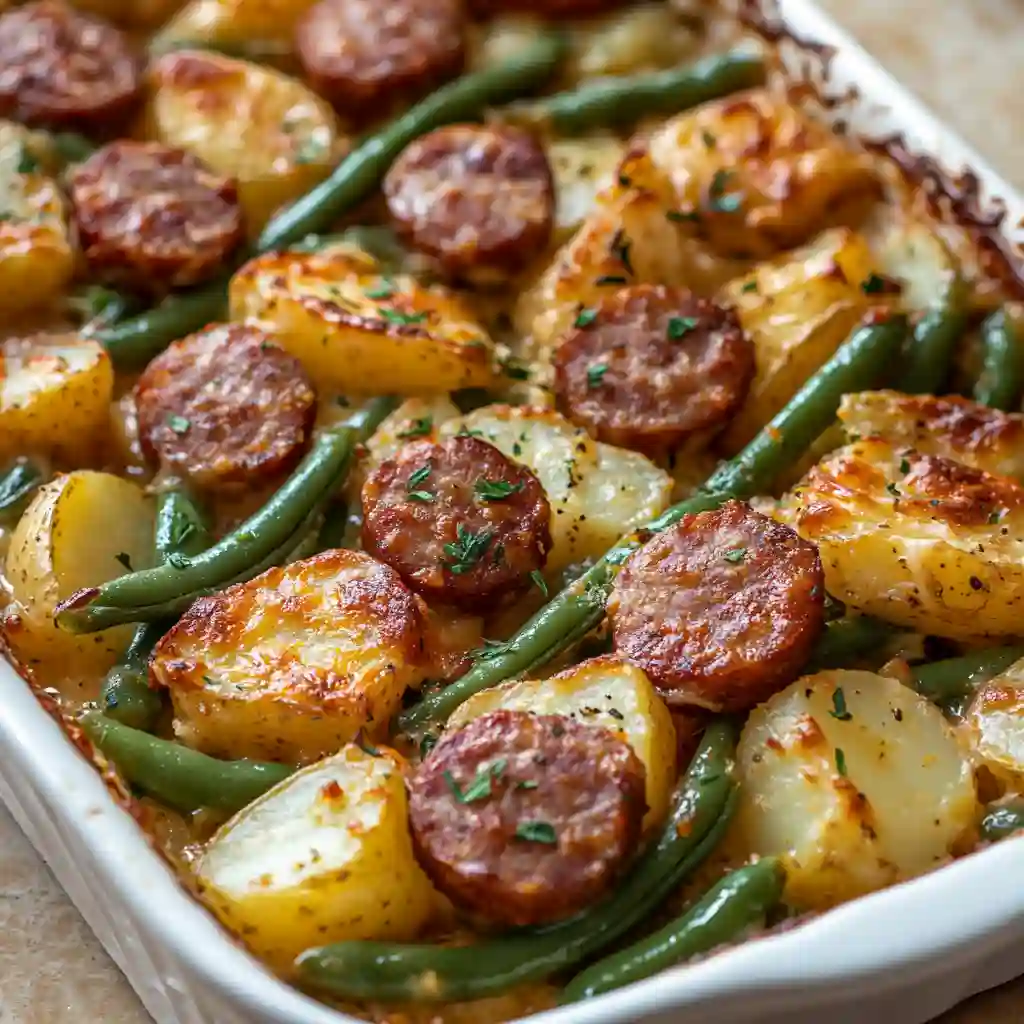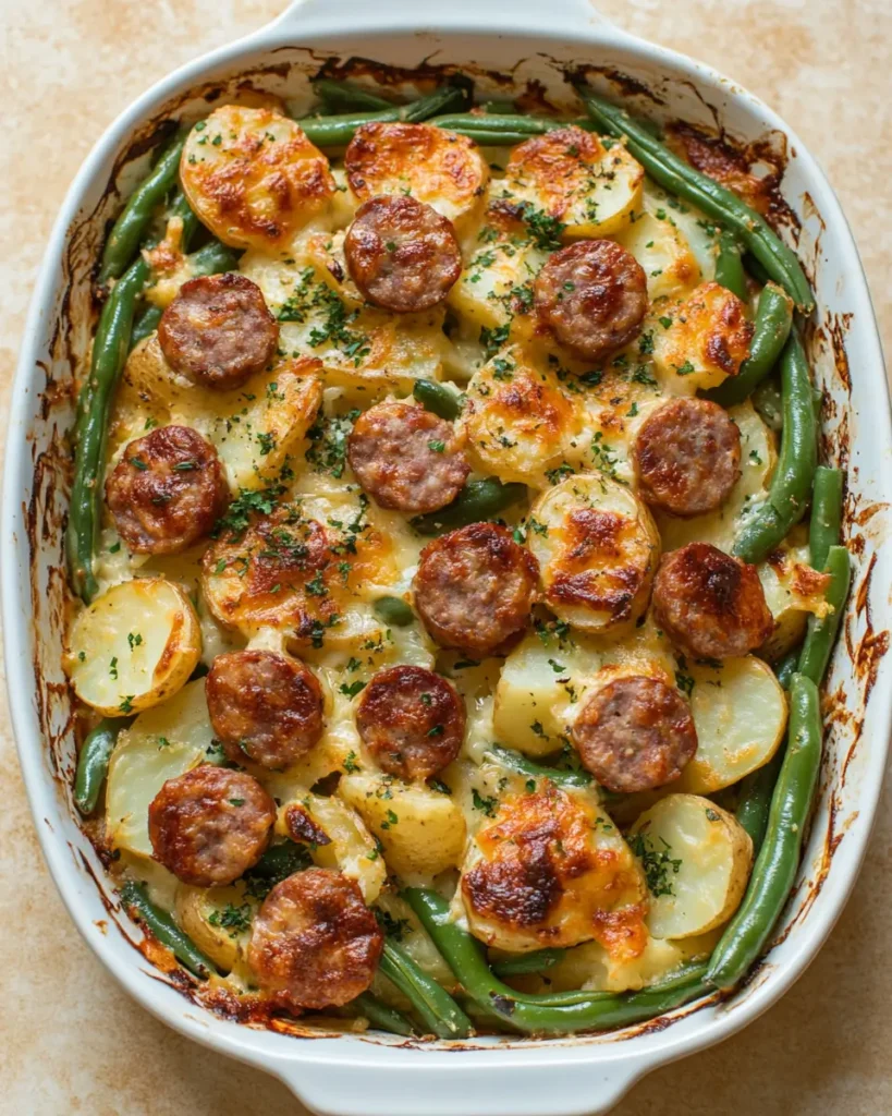 This Easy Casserole with Sausage and Green Beans is warm, cozy, and full of flavor. Juicy smoked sausage, tender potatoes, and fresh green beans bake together in one simple dish. It is perfect for busy nights when you want something filling and easy. Just mix, bake, and enjoy a hearty family dinner.