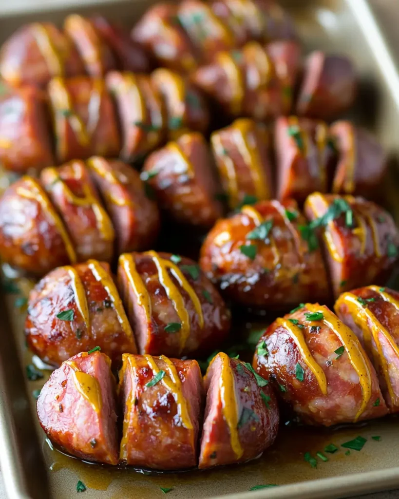 Absolutely. These bites fit beautifully on a sausage board. You can place them next to cheeses, crackers, and fresh fruit. The hasselback cuts make them look special without extra work. They also hold onto sauces well, so you can add dips like honey mustard or a light garlic sauce. It is a simple way to make your board feel full and inviting.