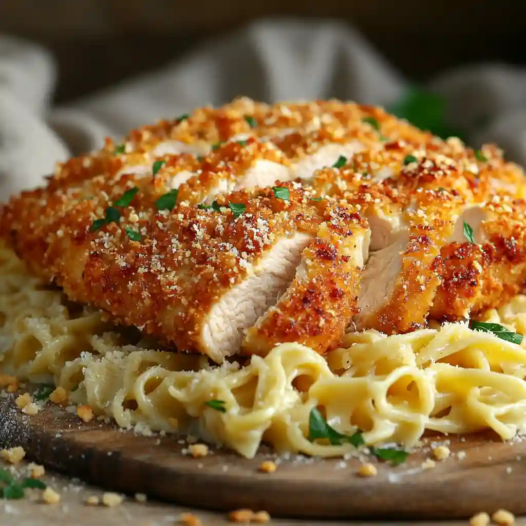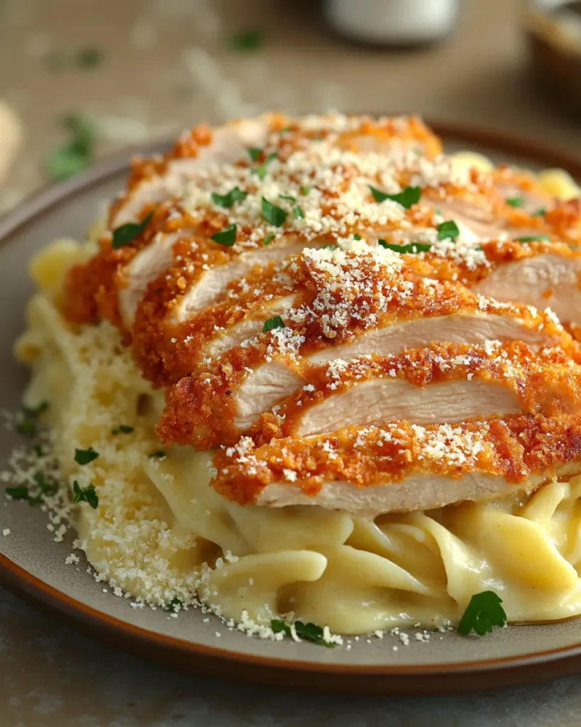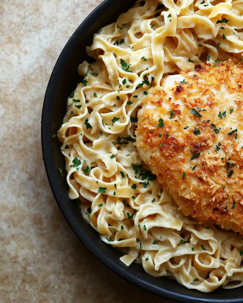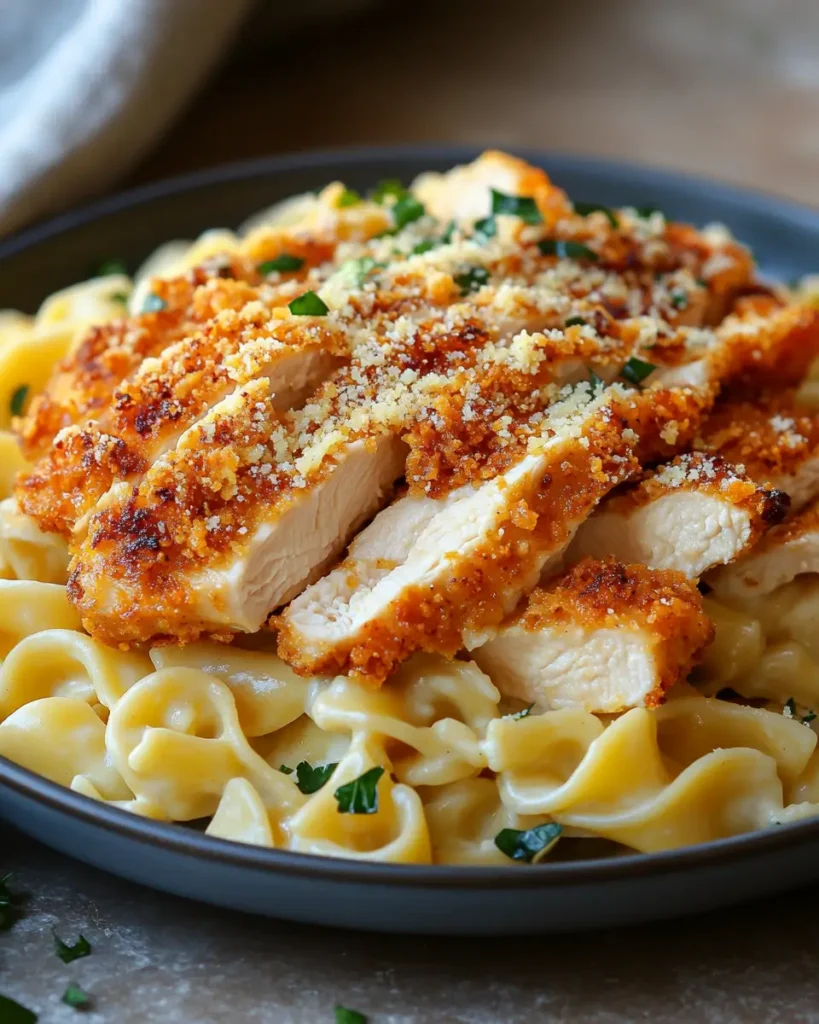 This meal is wonderful served warm with a simple green salad or roasted vegetables. The buttery noodles soak up the savory juices from the parmesan chicken and make every bite feel cozy and satisfying.