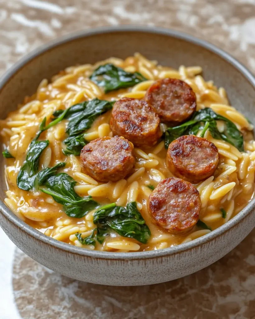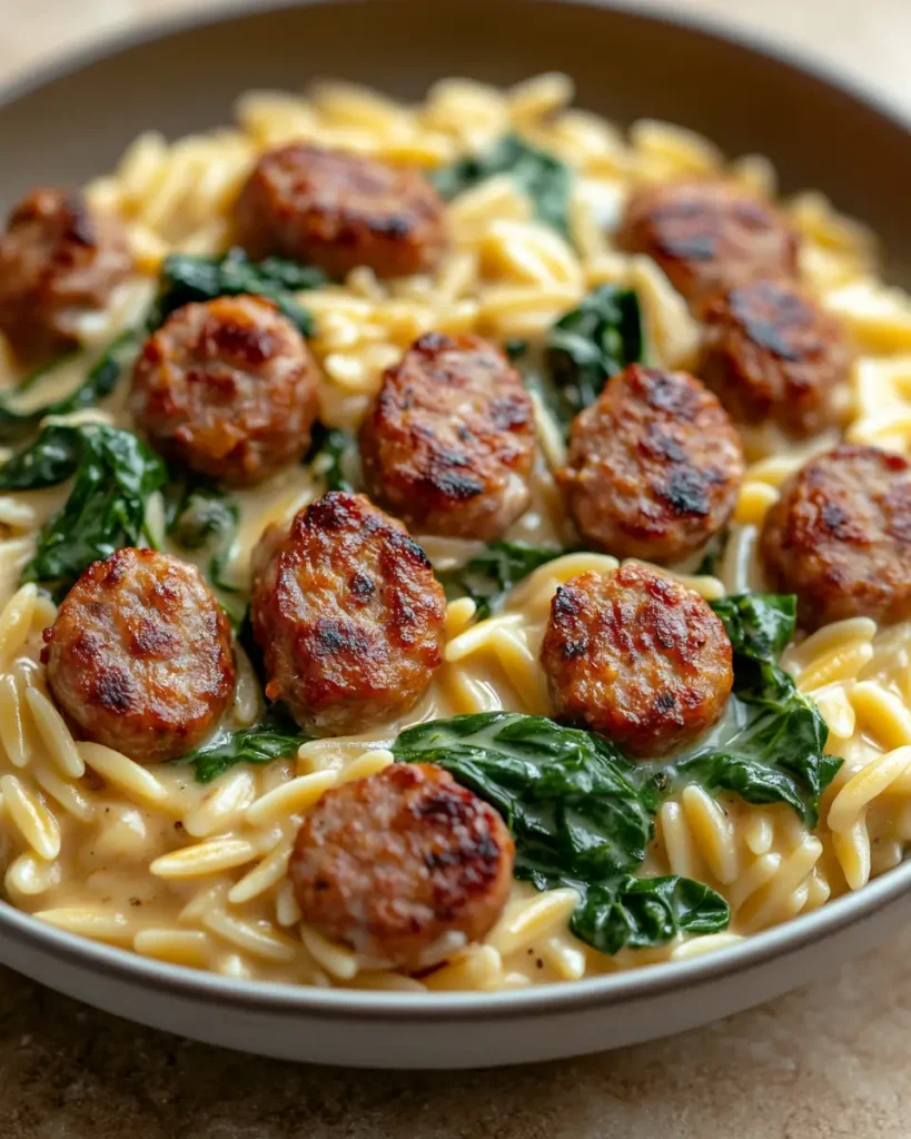 Creamy Italian Sausage with Orzo is a warm and cozy dinner made in one pan. Juicy sausage, tender orzo, and a smooth cream sauce come together for big flavor. Fresh spinach and Parmesan add color and taste. It is simple, filling, and perfect for busy nights.