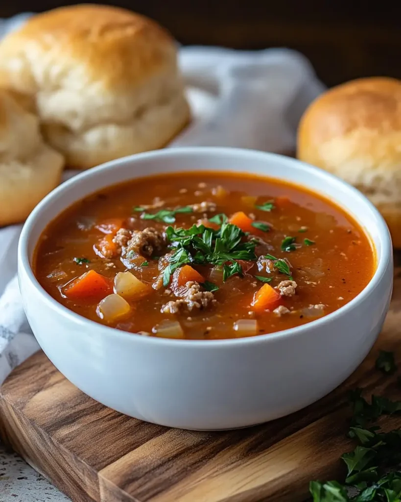 This Easy Stuffed Pepper Soup is lovely with warm rolls or a simple garden salad. A sprinkle of cheese on top adds a soft melt that blends into the broth. If you want to stretch the soup dinner for more people, serve with toasted bread. A small spoon of sour cream on top gives a cool and creamy balance.