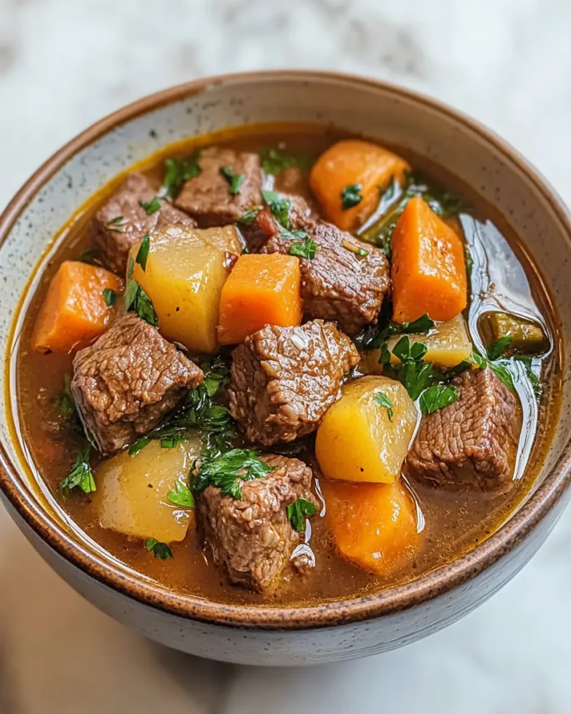 This stew freezes very well and keeps its texture after reheating. Let it cool fully before transferring to freezer safe containers. Because the broth is thick and balanced, it does not separate when thawed. Reheat gently on the stove so the beef stays tender. This makes it ideal for planning ahead during busy weeks.