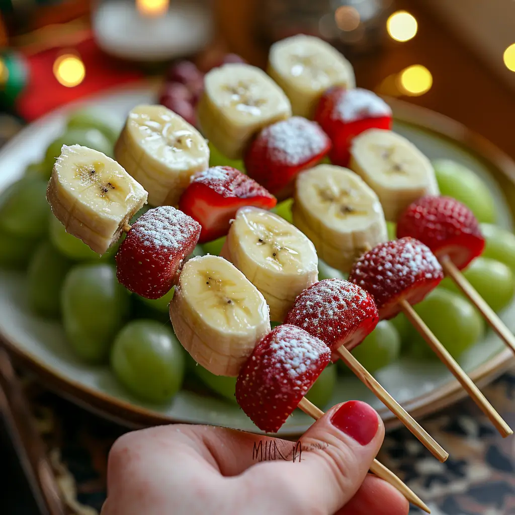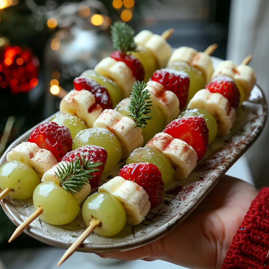 Make sure to use firm fruit and press each layer gently together. Short skewers or toothpicks work best. If you’re serving them on a large Christmas Party Snacks platter, tuck the base of each skewer into a foam block or watermelon base for extra stability.