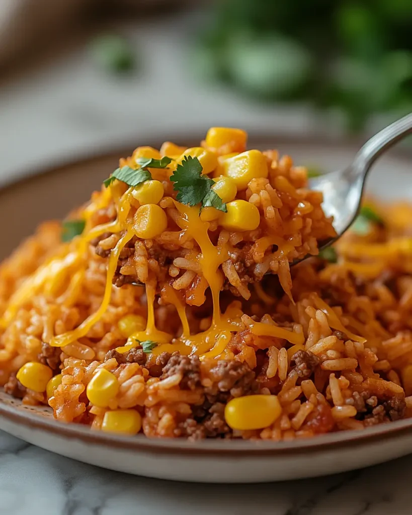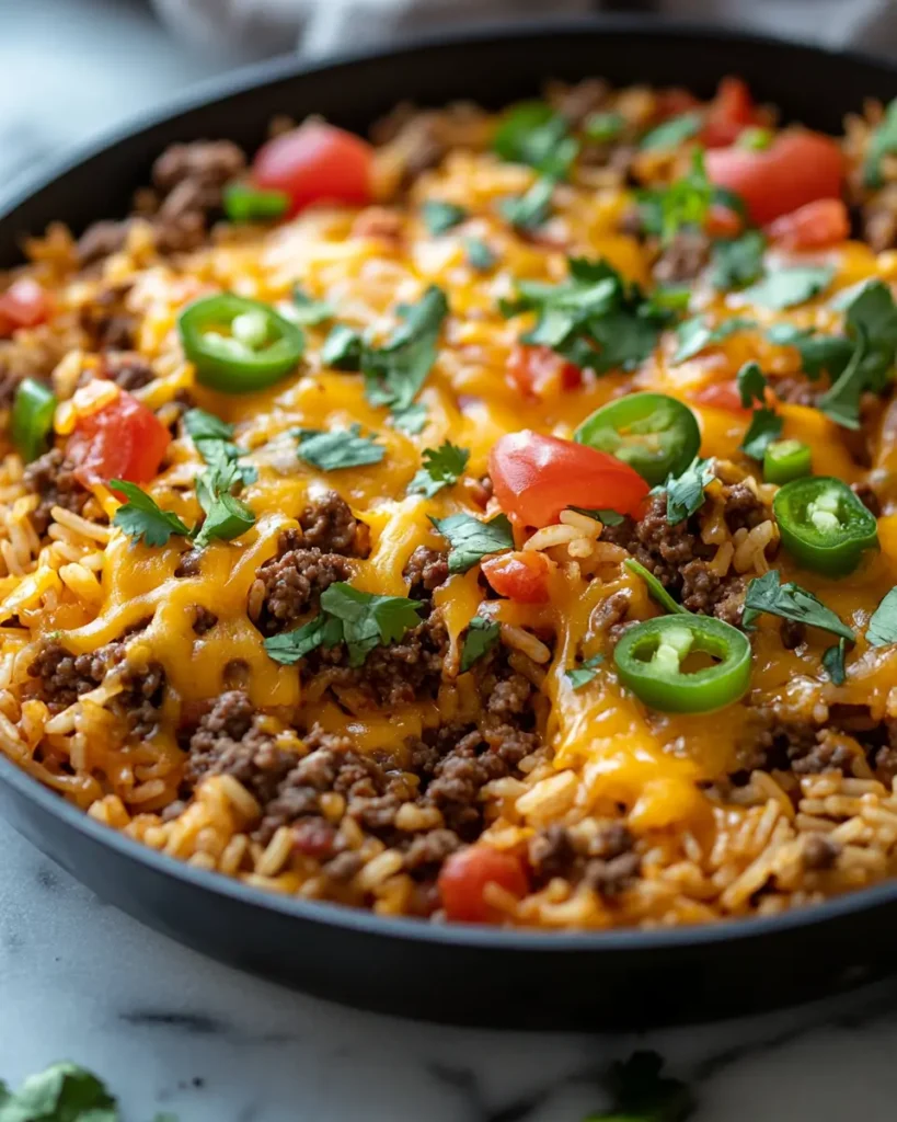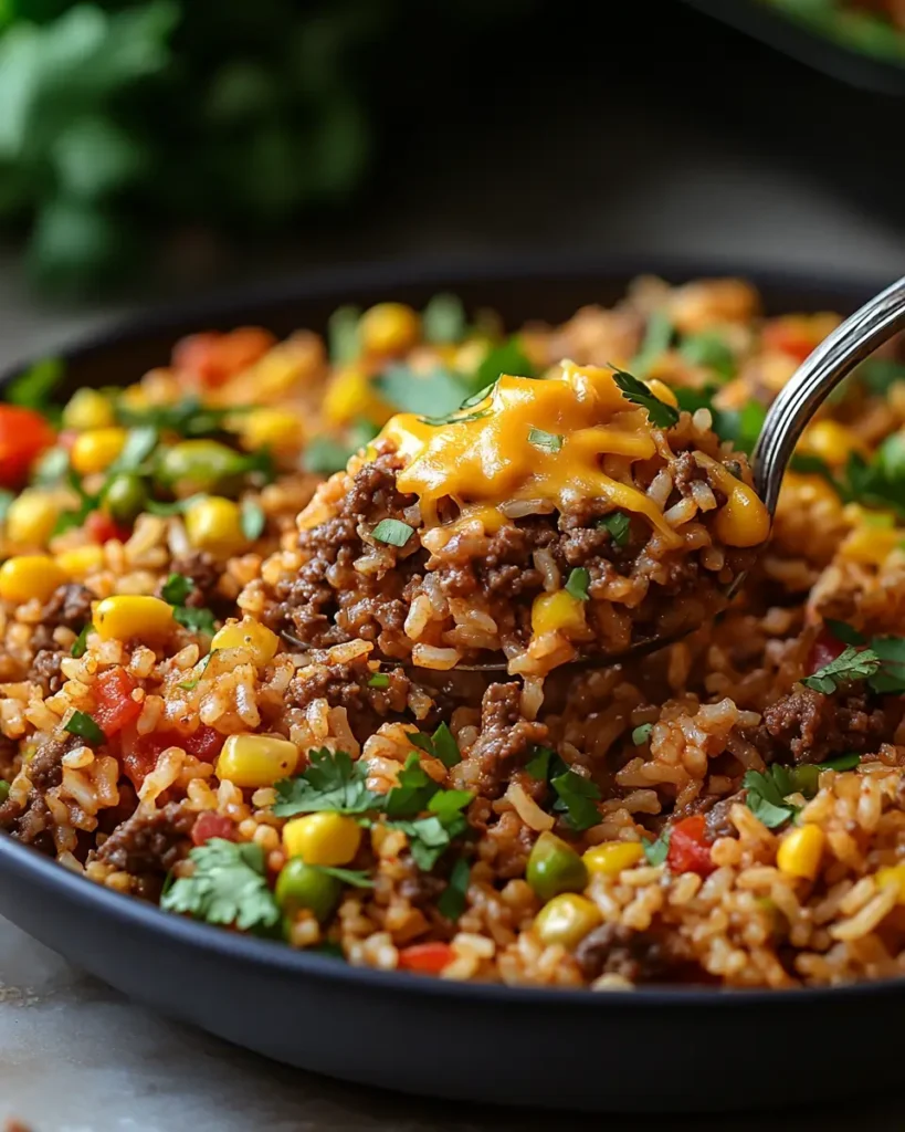 Serve this dish straight from the skillet with a simple green salad or sliced avocado. A spoon of sour cream on top adds a cool contrast. Warm tortillas on the side turn this into a fun build your own plate. If you enjoy hearty rice and ground beef recipes simple like this one, you may also like this cheesy ground beef potato casserole for another comfort meal idea.