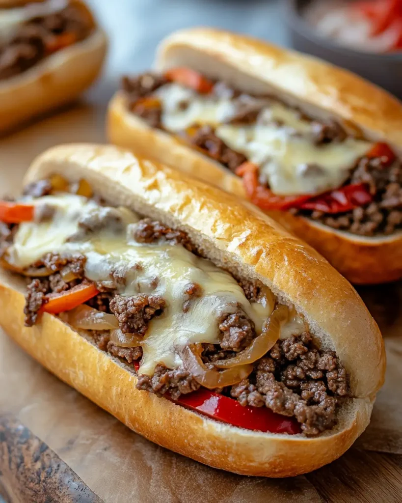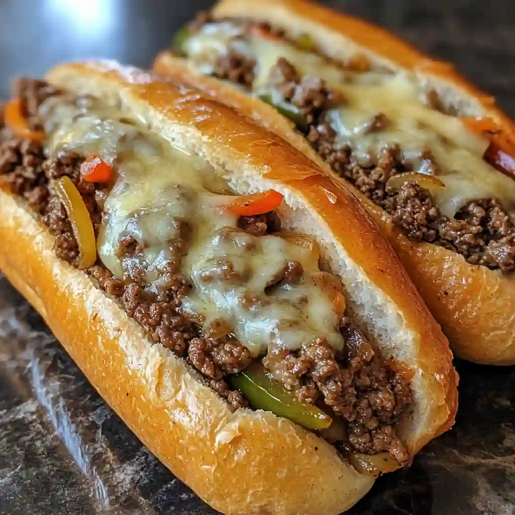 - This ground beef cheesesteak cooks faster than sliced steak and stays juicy.