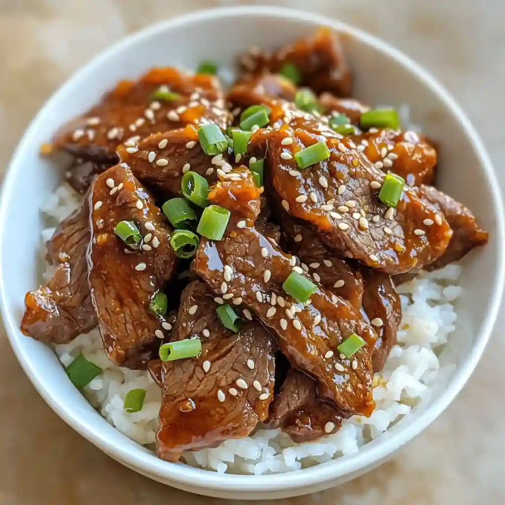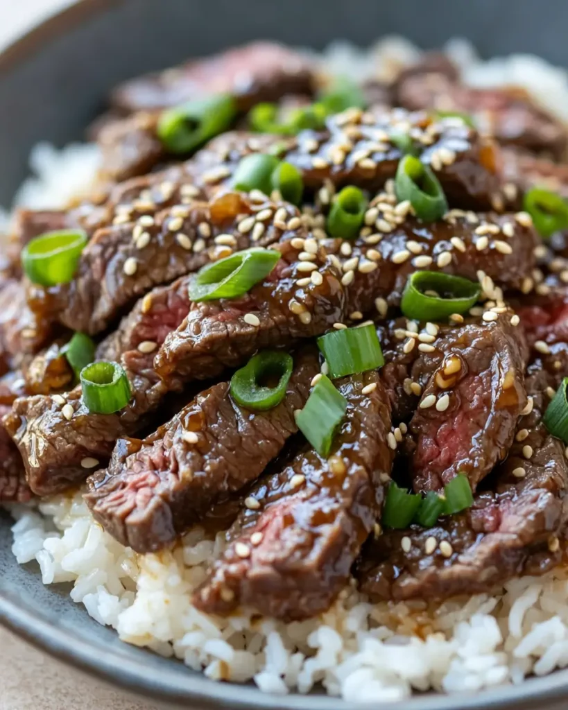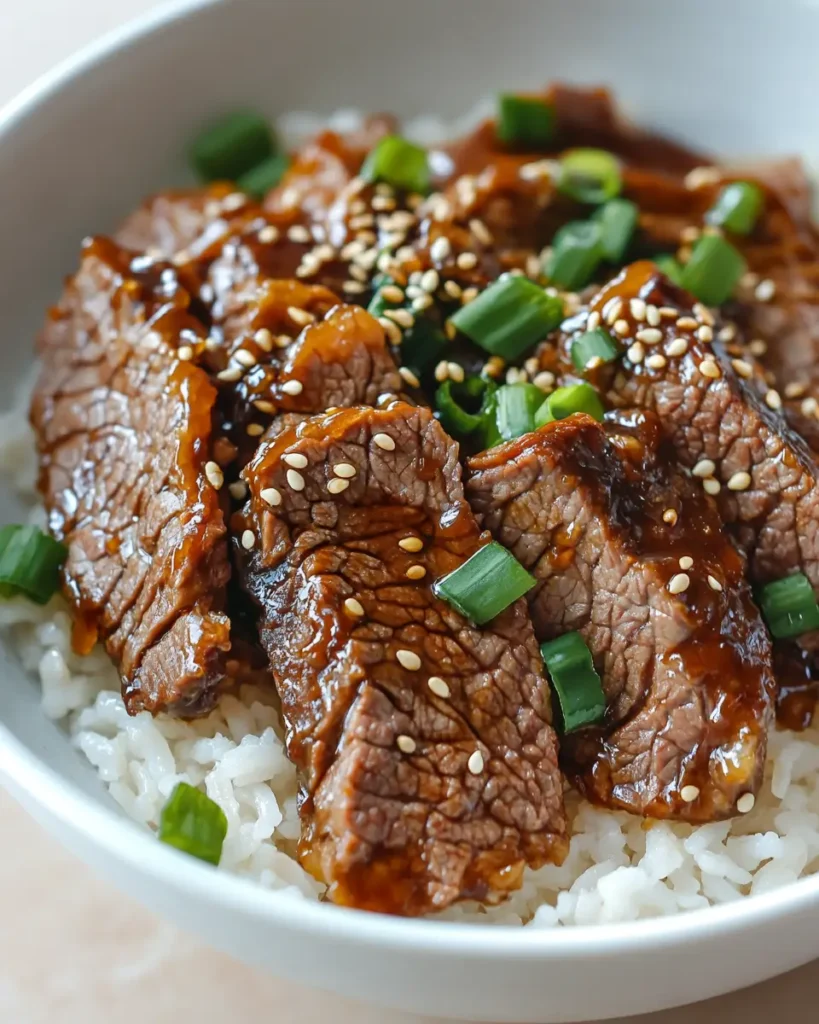 - Spoon warm rice into bowls, top with the beef, and garnish with sliced green onions and sesame seeds before serving.