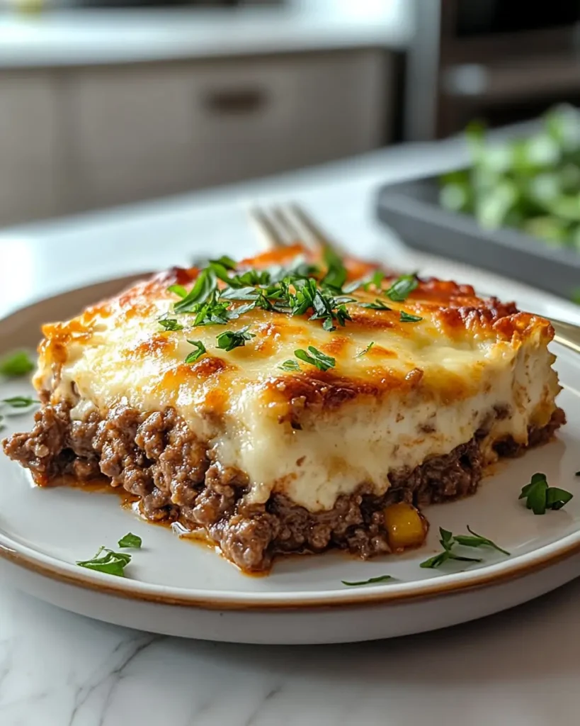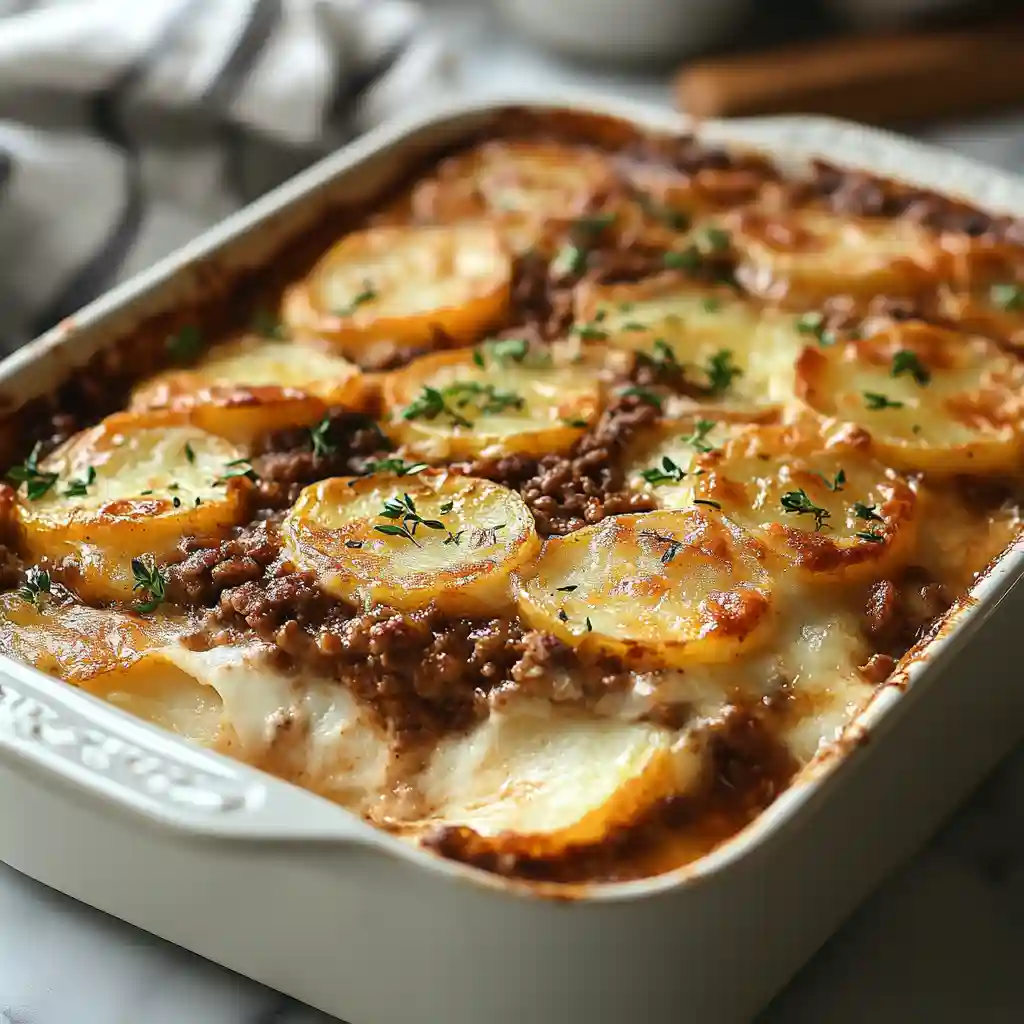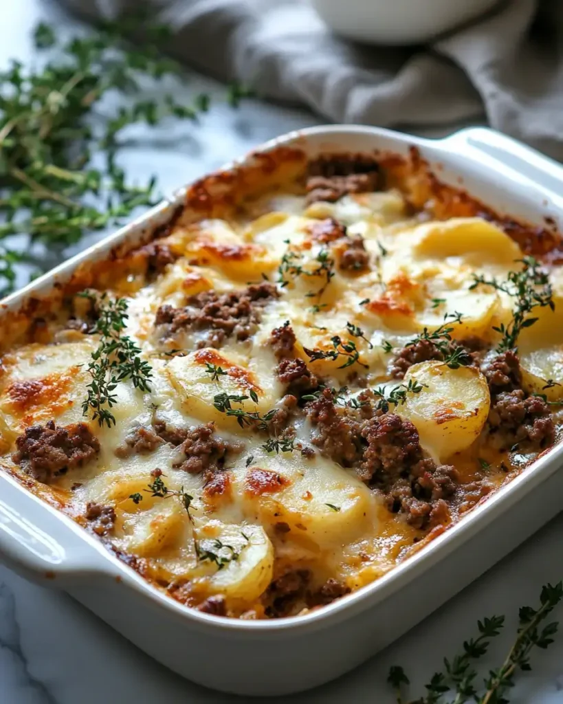 A hearty, comforting casserole layering seasoned ground beef, potatoes, creamy sauce and melted cheese a simple all-in-one meal for weeknights or family dinners.