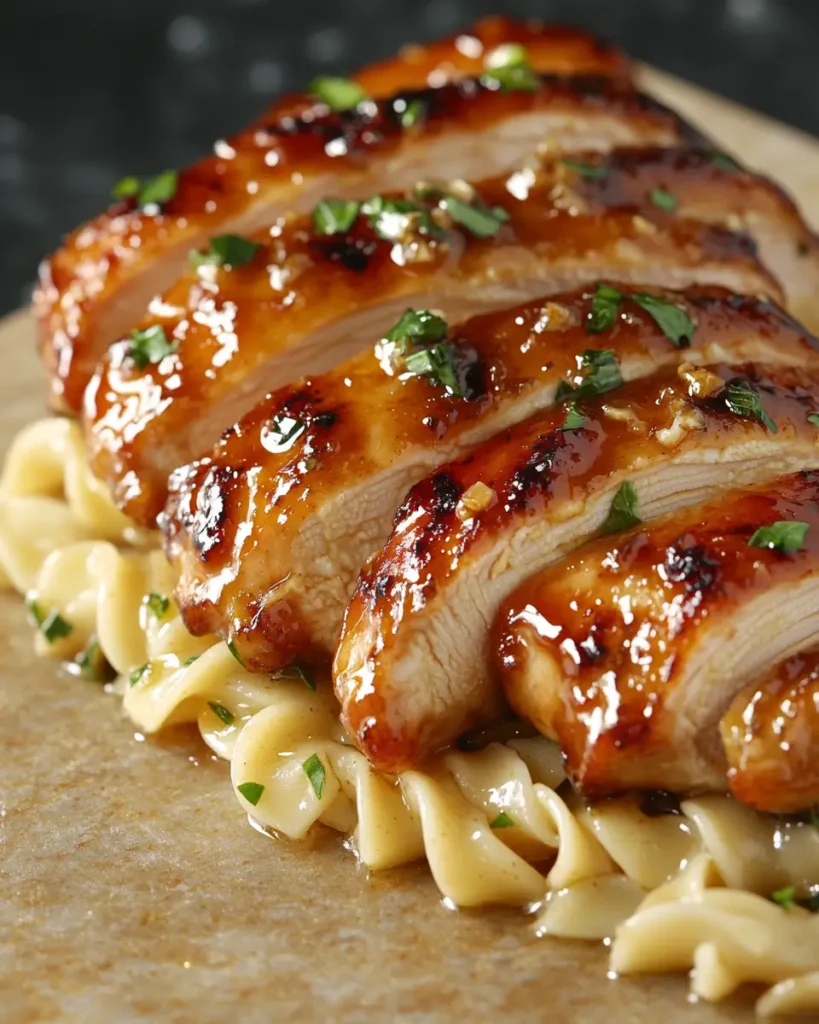 - Serve the honey garlic chicken over buttered noodles. Spoon extra sauce on top and garnish with fresh parsley if desired.