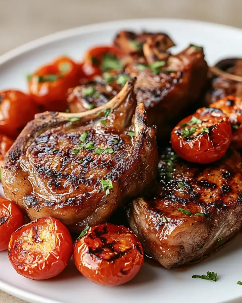 - Charred cherry tomatoes add natural sweetness and balance the rich lamb chops.