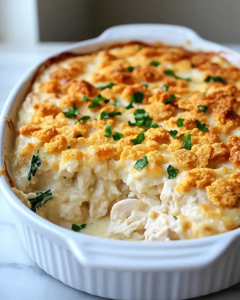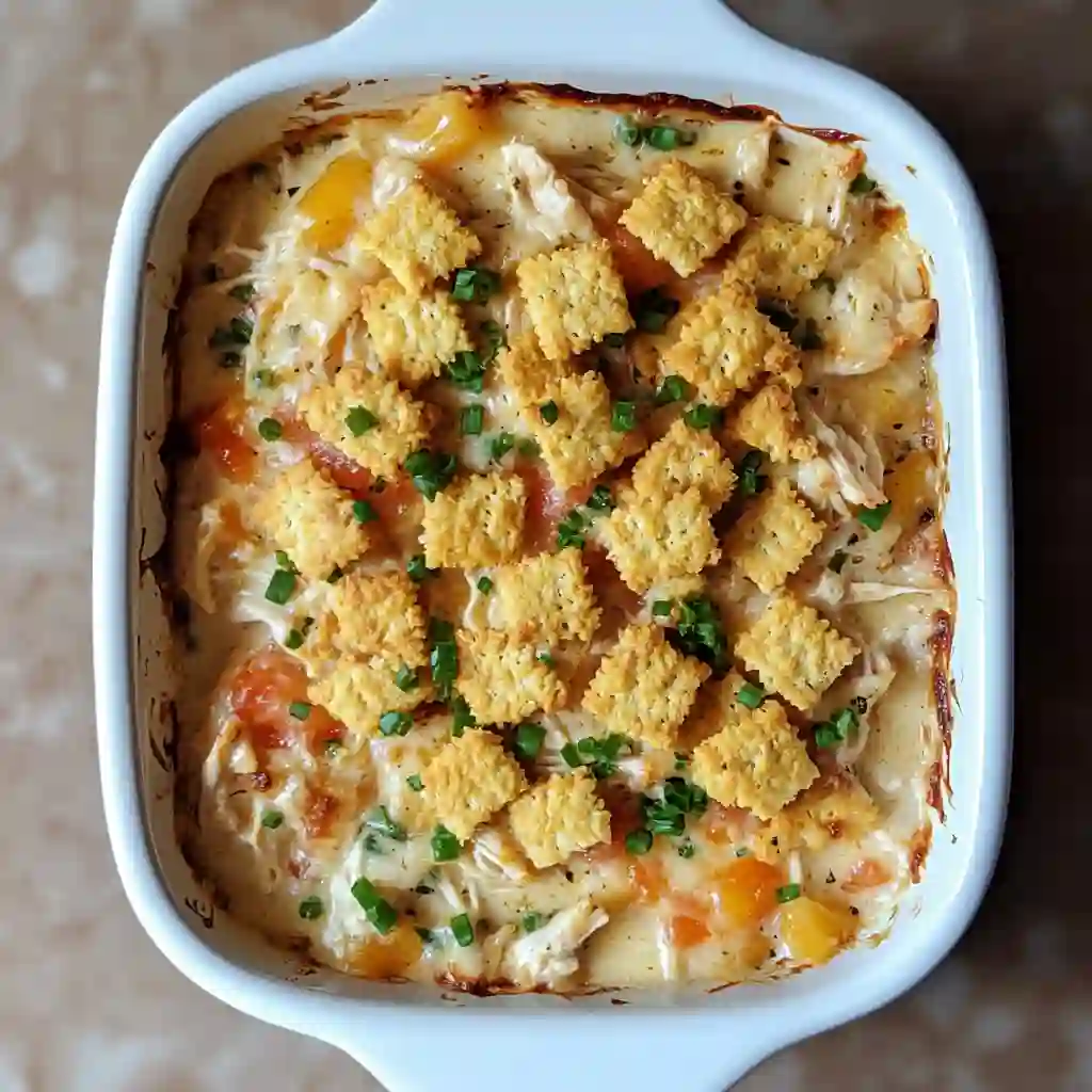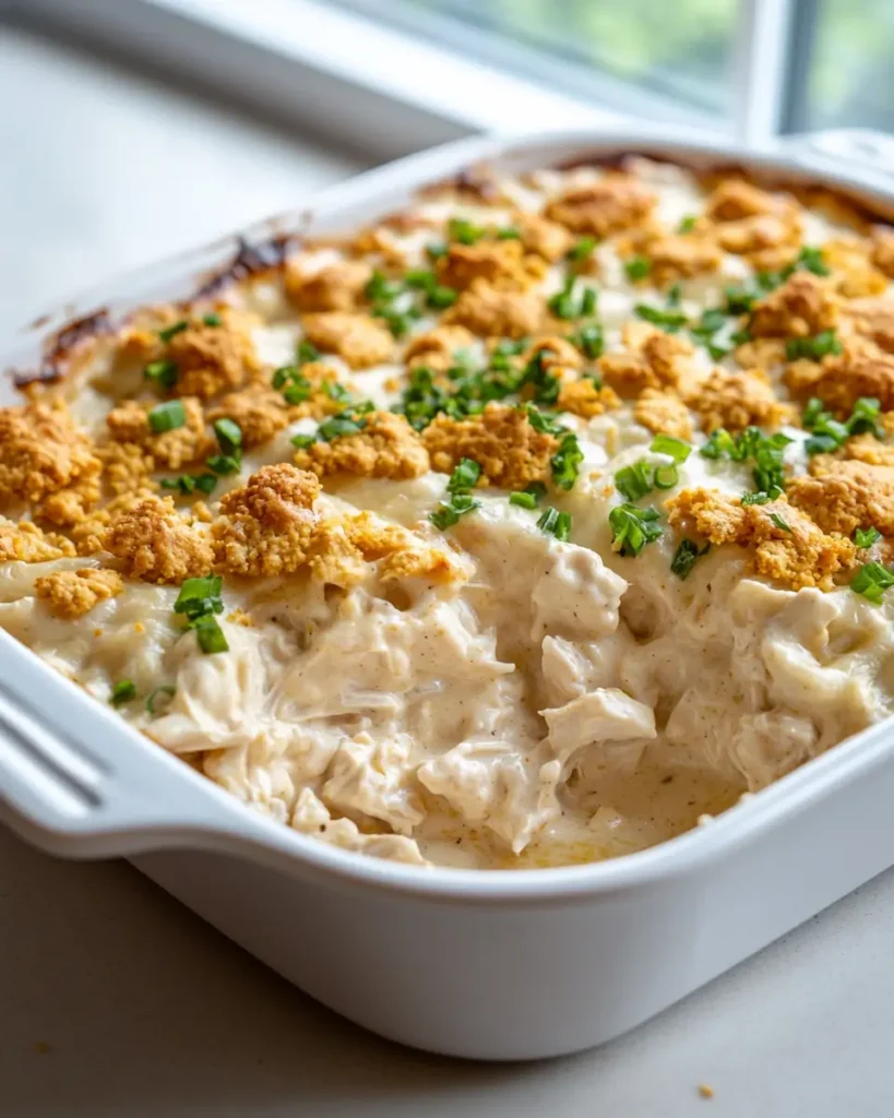 Yes, this casserole works very well as a make ahead meal. Prepare the creamy chicken mixture and spread it into the baking dish. Cover the dish tightly and store it in the refrigerator for up to one day. When dinner time arrives, add the buttery cracker topping and bake as directed. Because the casserole already holds rich creamy ingredients, it reheats beautifully and stays moist. This method helps busy families keep dinner simple while still serving comforting kid friendly dinners that feel homemade and warm.