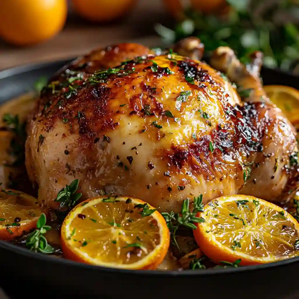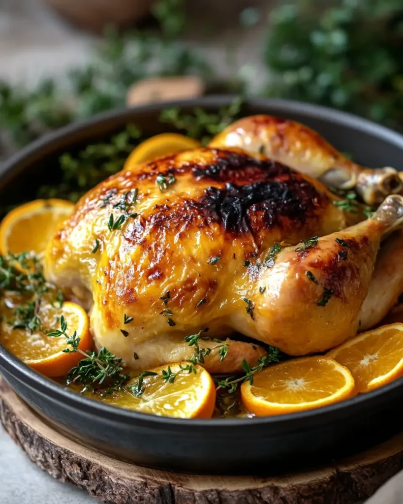 Serve this whole roasted chicken with simple sides. Think roasted potatoes, green beans, or a crisp salad. The citrus pan juices are lovely over rice or mashed potatoes. For a holiday spread, it fits right in with Thanksgiving Dinner favorites. If you enjoy classic roast chicken recipes, you may also like this Italian herb roasted chicken for another cozy option.