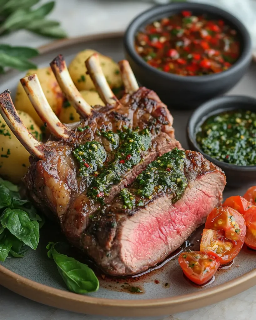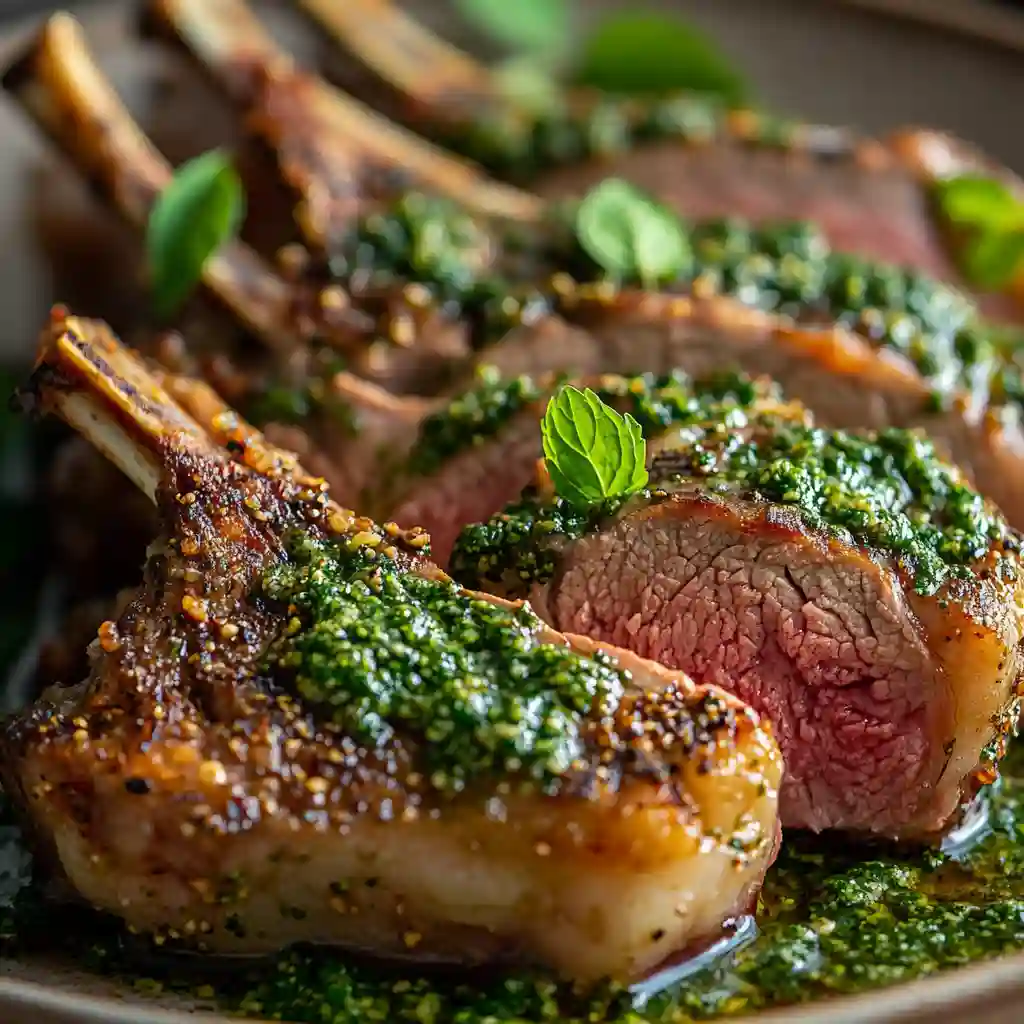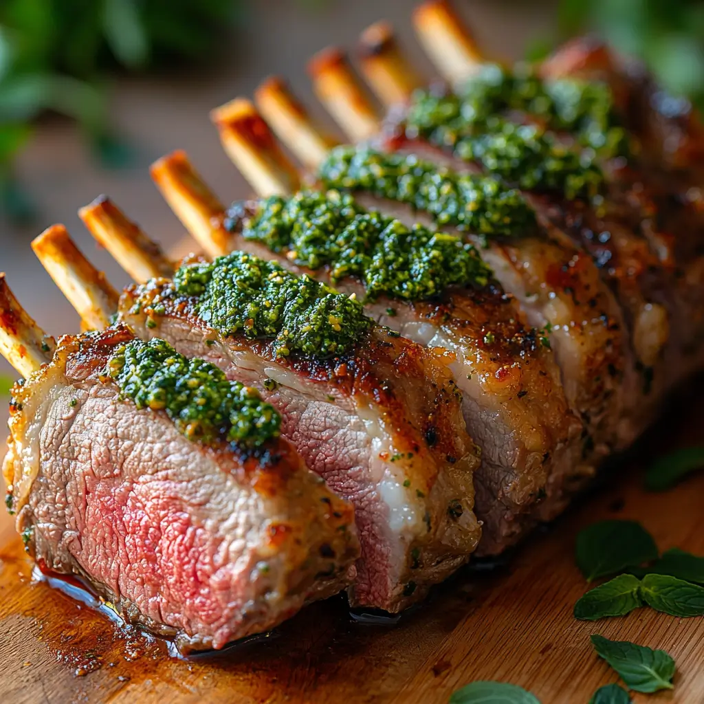 6. Remove the lamb from the oven and let it rest for 10 minutes. Slice between the bones and spoon the pesto over the top before serving.