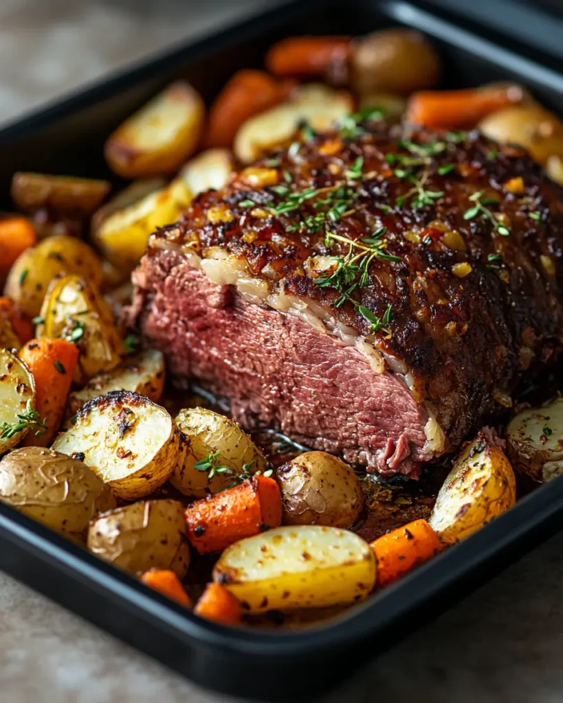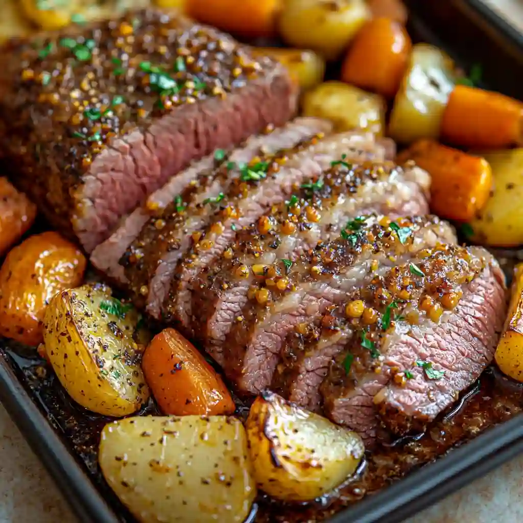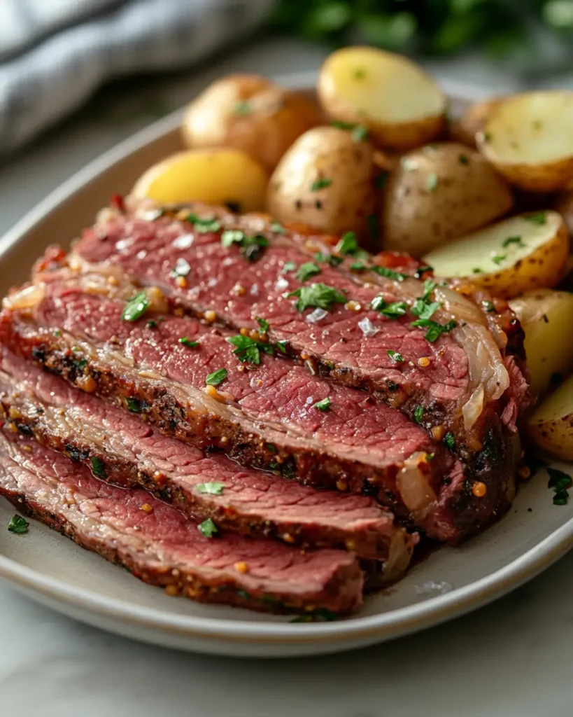 Serve slices of beef with roasted vegetables and a spoon of pan juices. This pairs well with classic corned beef sides like buttered potatoes or simple green beans. For another easy dinner idea, try this easy corned beef and cabbage recipe.