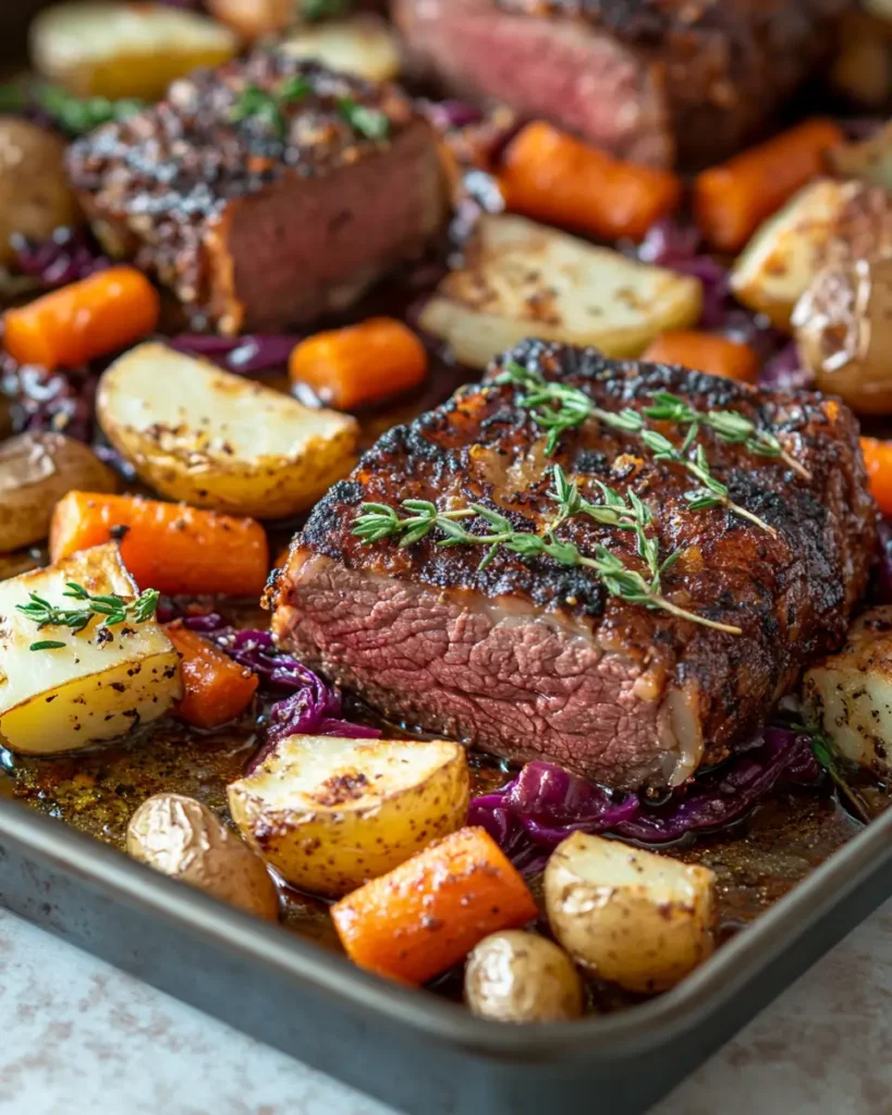 Do not slice the beef right away. Resting helps keep it juicy. Avoid overcrowding the pan, since packed vegetables steam instead of roast. Always slice against the grain or the meat will feel tough. Skipping the foil at the start can dry out the brisket, so keep it covered first.