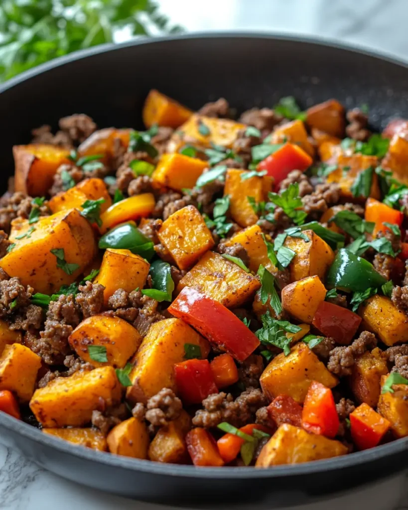 This skillet stores well and reheats smoothly, making it ideal for meal prep. Let it cool fully, then store in an airtight container in the refrigerator for up to four days. Reheat gently on the stove or in the microwave with a splash of water to keep the sweet potatoes tender and the beef juicy.