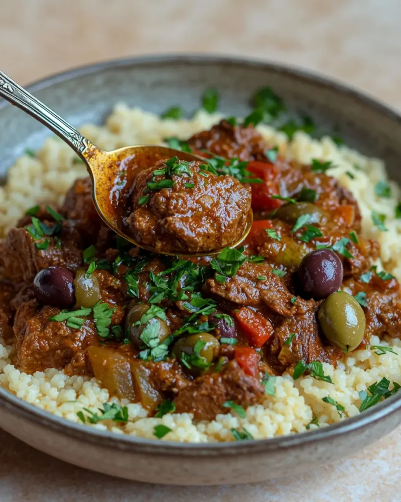 Spiced Lamb Tagine is a warm and comforting dish made with tender lamb slowly cooked with vegetables, gentle spices, apricots, and olives. The rich sauce and soft meat create a hearty meal that pairs perfectly with couscous, rice, or fresh bread.